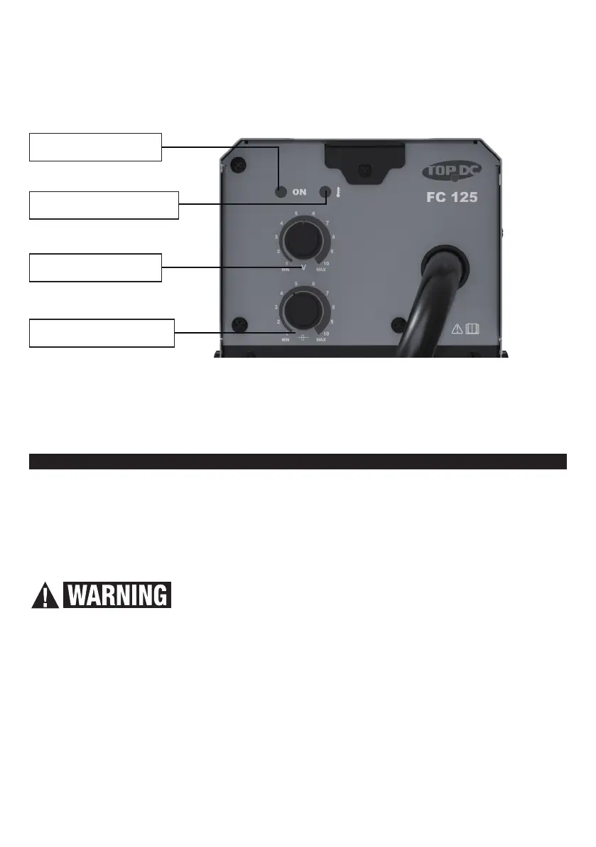 4. Wire Feed Speed Knob and Scale: Turn the knob to adjust wire feed speed.