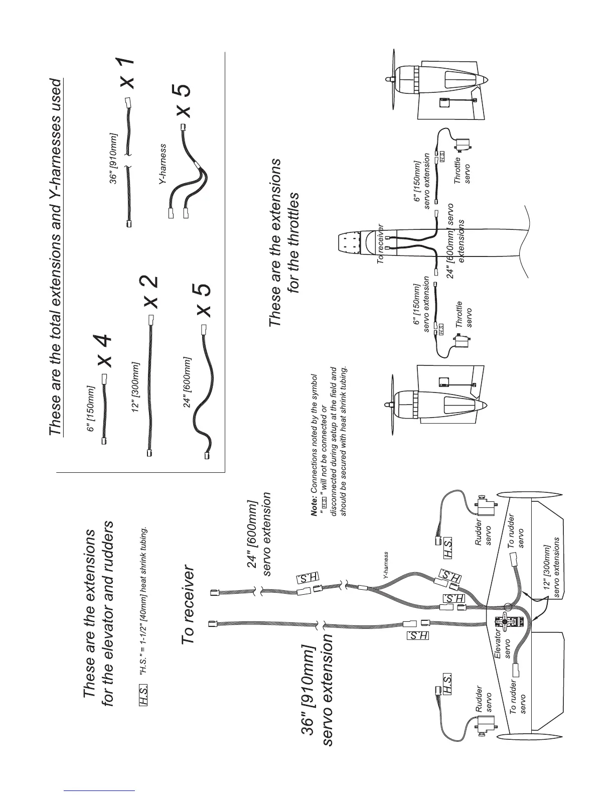 Top Flite B-25J Mitchell - SERVO EXTENSION AND Y-HARNESS CONFIGURATIONS; Diagrams for Elevator, Rudder, Throttle, Aileron, and Flap Connections