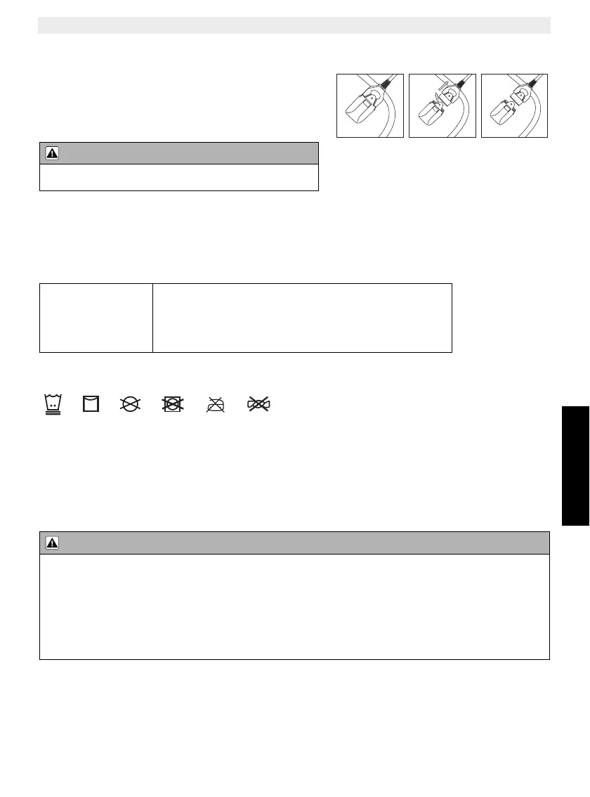 • Nicht in der Sonne trocknen oder bügeln – dies führt zur Alterung der Isolierschicht und zu Sicherheitsproblemen
