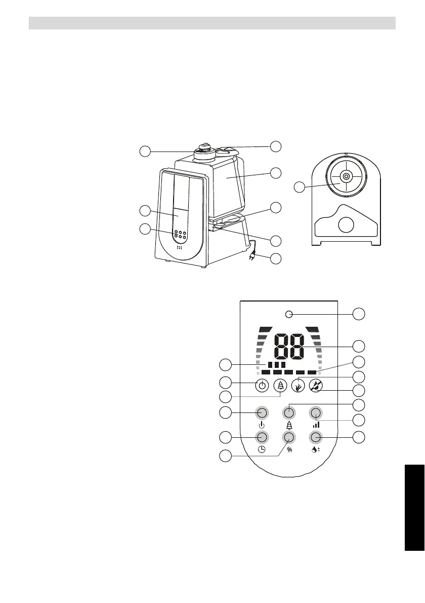 Medföljande fjärrkontroll har samma knappar som frontpanelen. Ikonerna är desamma.