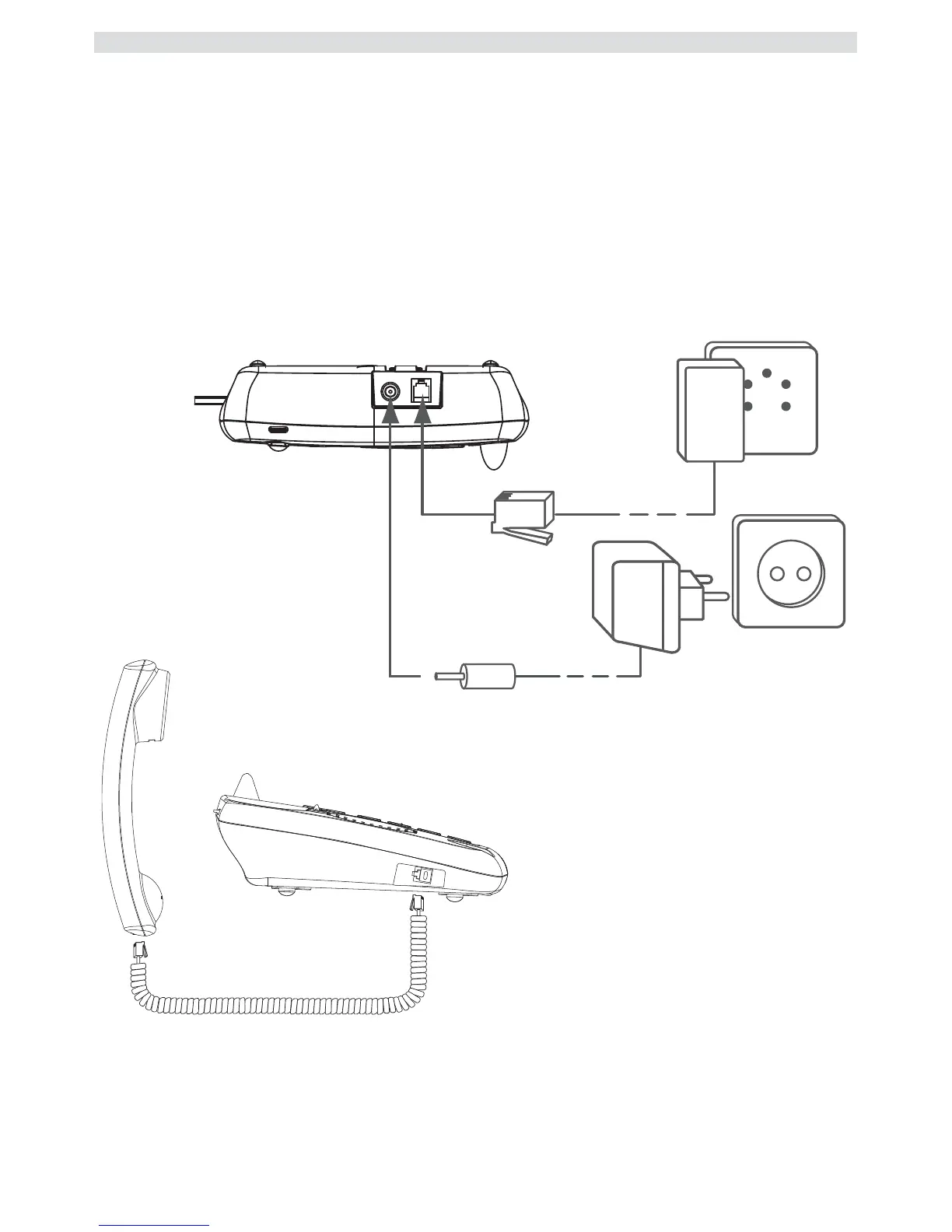 3 El teléfono y los cables de alimentación deben conectarse como