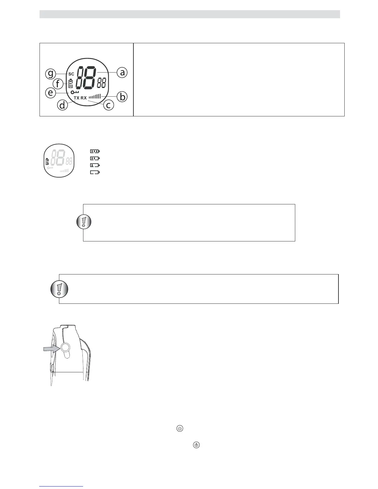 • Käynnistä laite painamalla ja pitämällä pohjassa -näppäintä. Laite “piippaa” ja nestekidenäytöllä näkyy