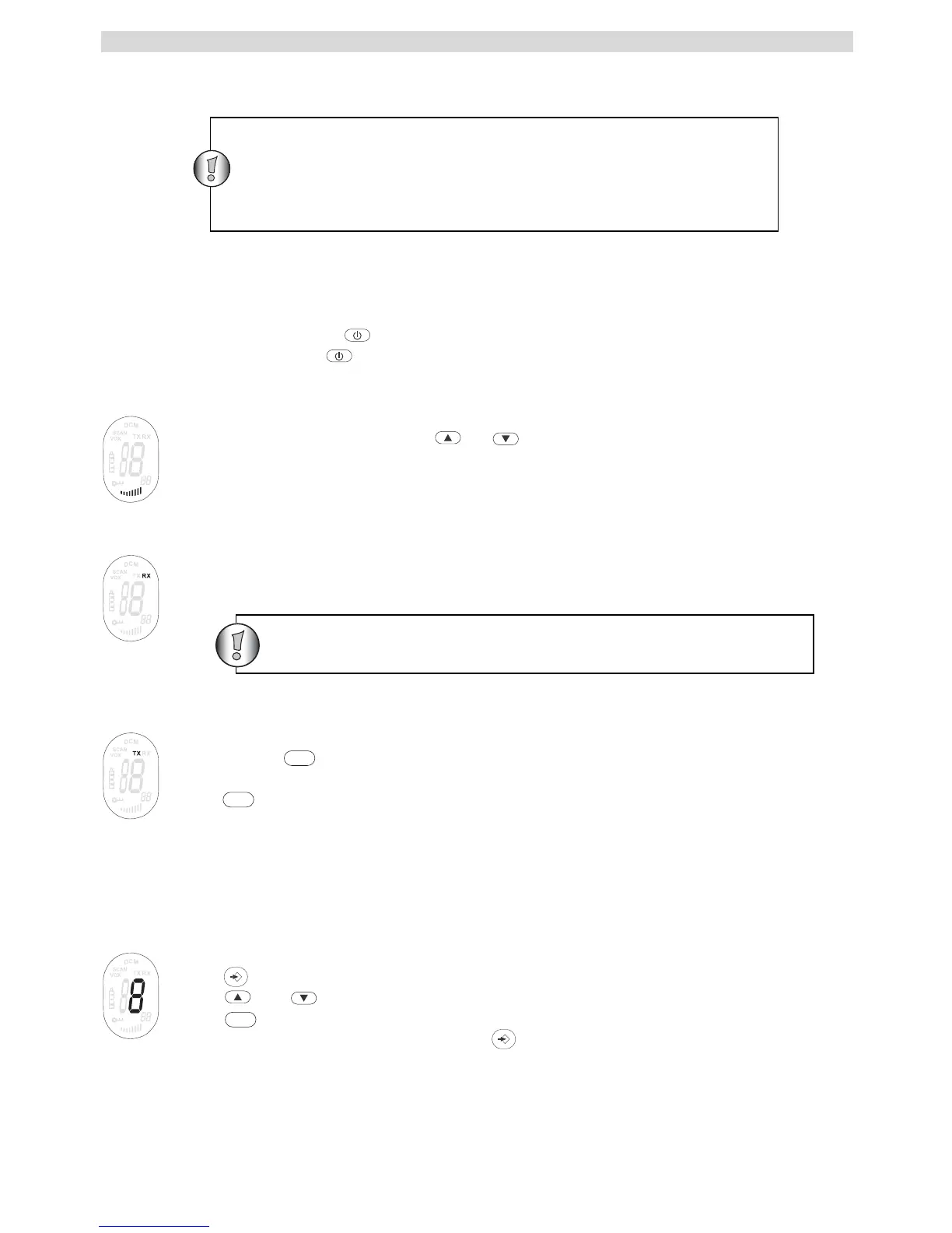 • For å aktivere; Trykk og hold . Enheten vil "pipe", og LCD-skjermen vil vise aktuell kanal.