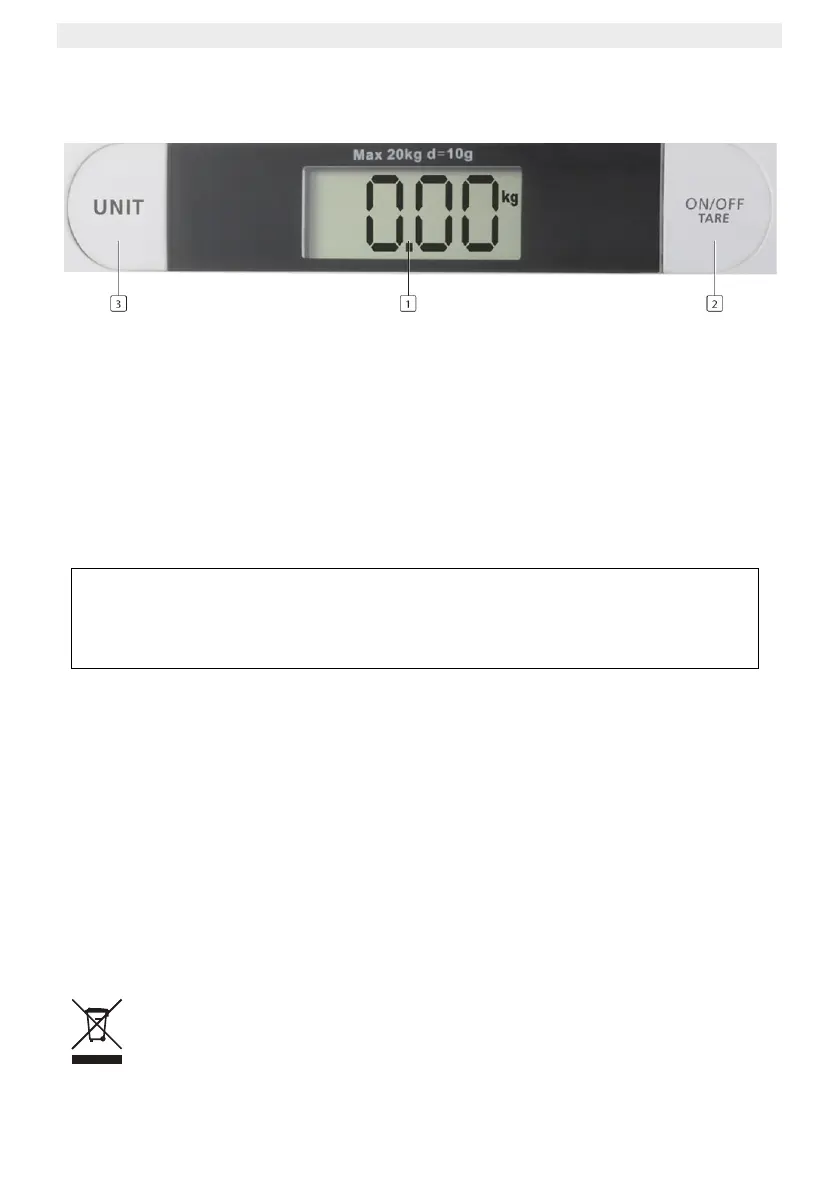 •Naciśnij i przytrzymaj przez kilka sekund Przycisk WŁ./WYŁ/TARY (2), aby wyłączyć wagę lub