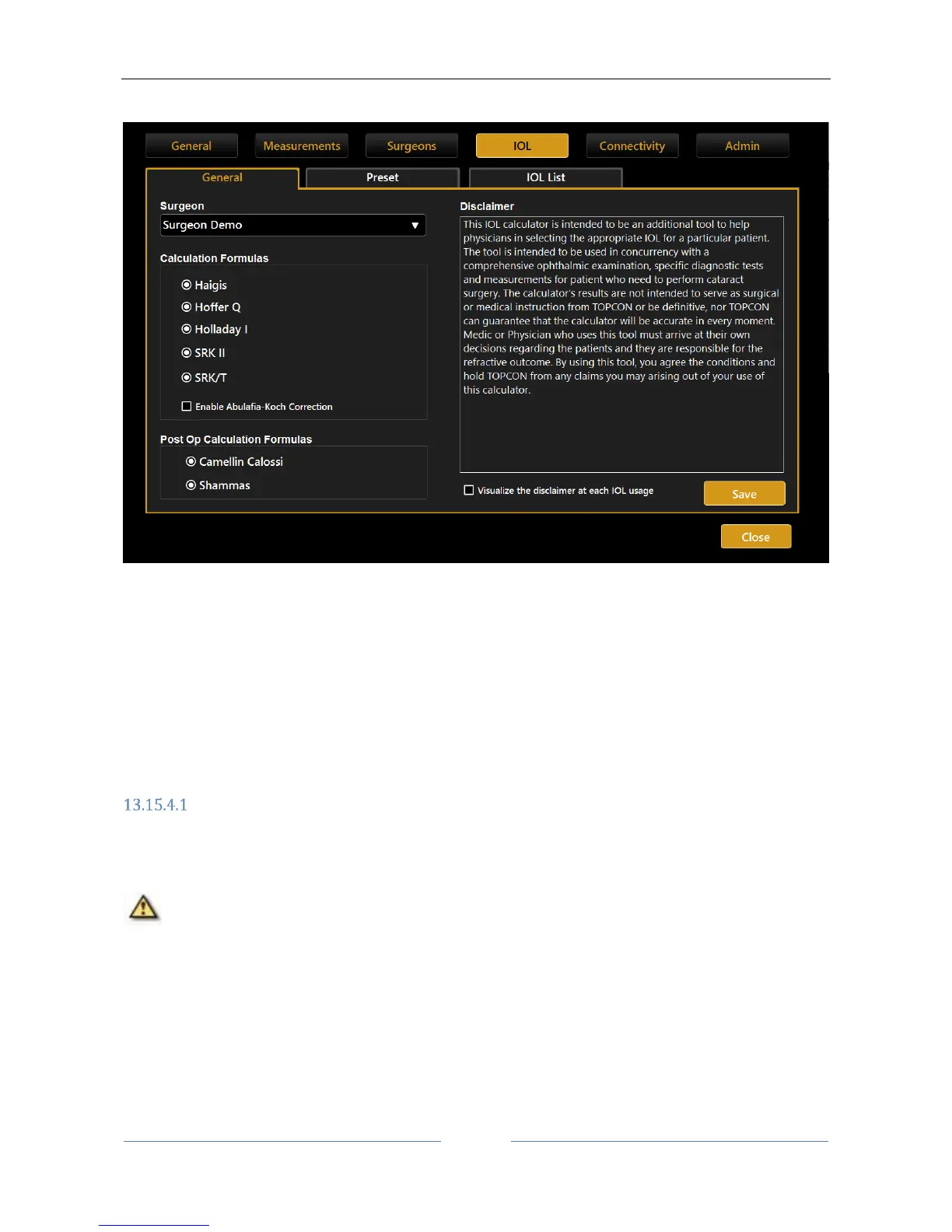 General environment (Figure 77)displays the terms and conditions of use of the IOL calculation section and
