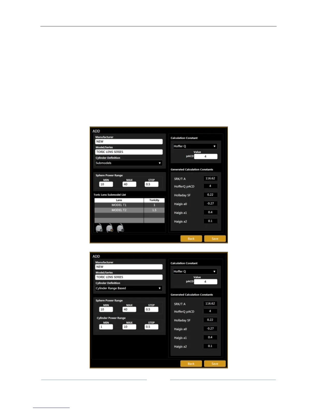 o Choose the “Cylinder Definition” of the lens, with “Sub models” or “Cylinder Range Based”.