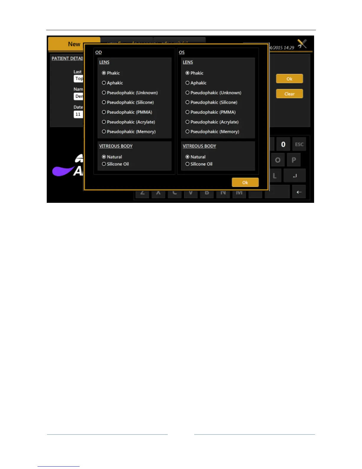 Aphakic: the patient does not have any crystalline lens from birth or as a result of surgery.