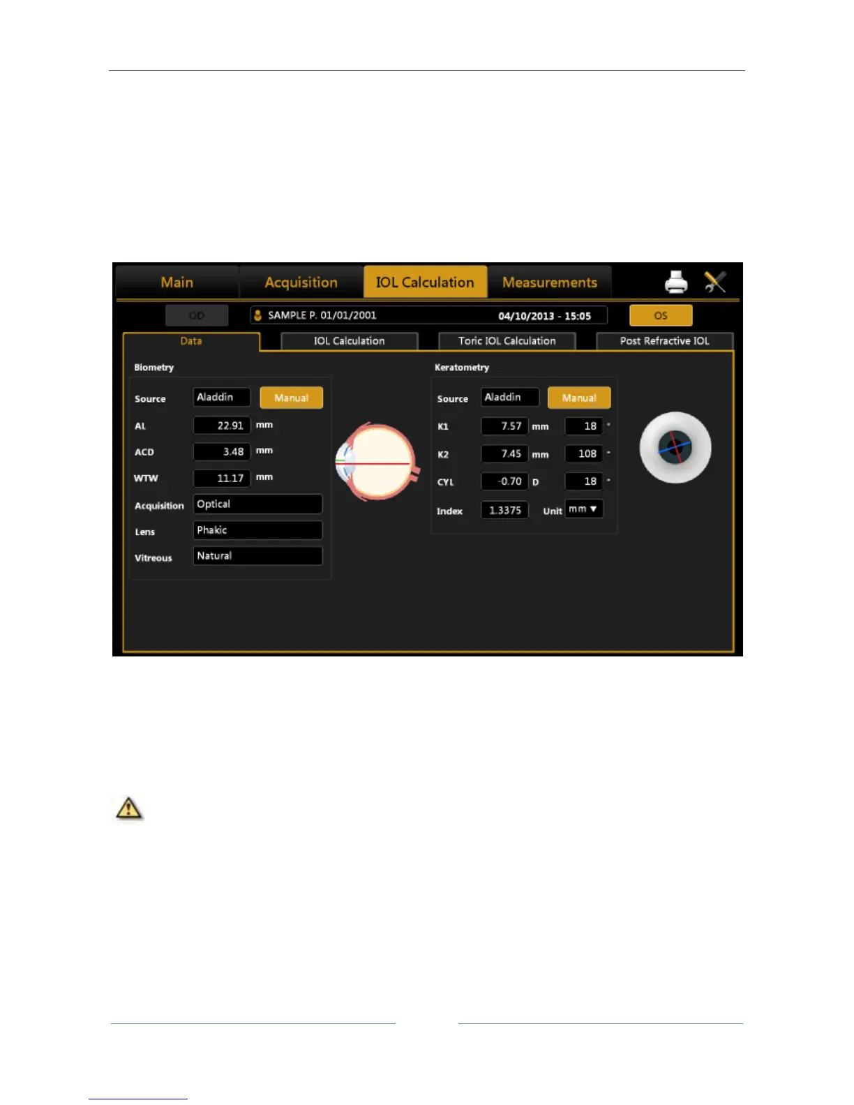 ALADDIN also includes a section for calculation of the intraocular lenses (IOL Calculation).