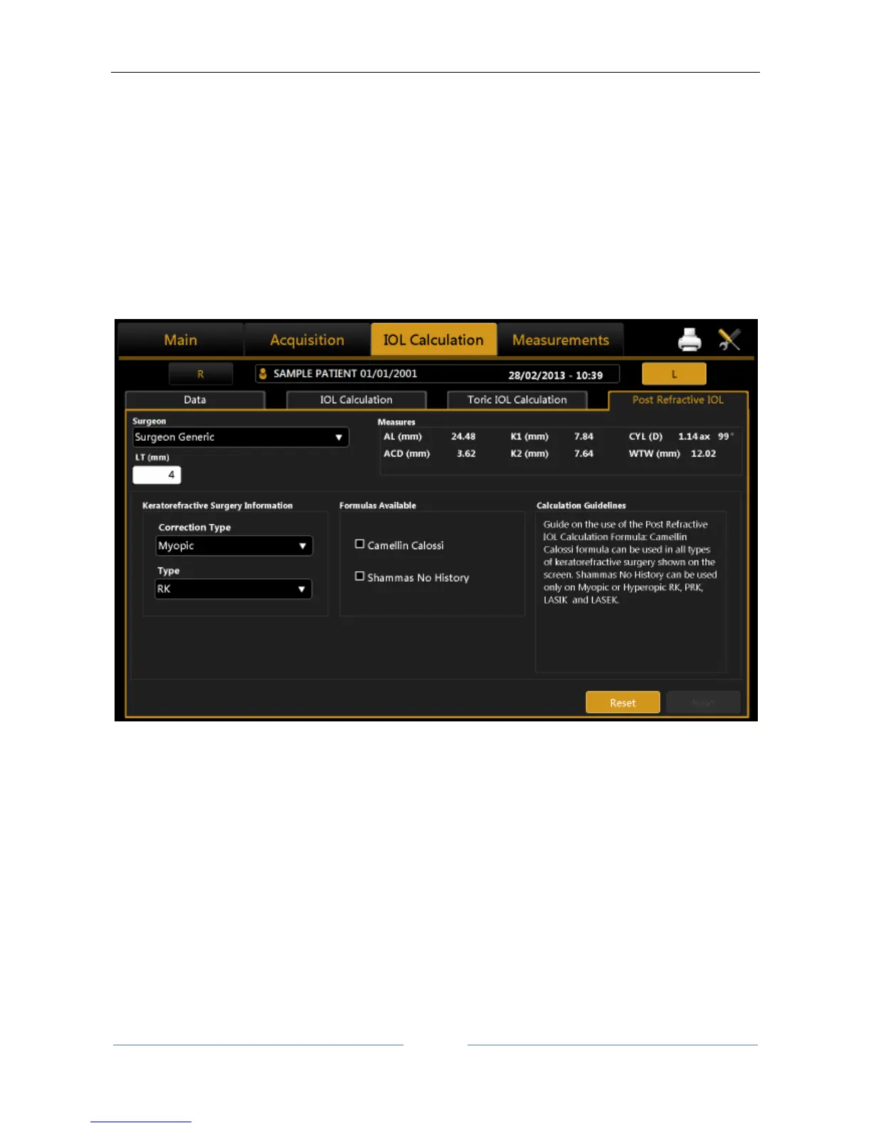 In this section, you can calculate intraocular lenses also for patients who have undergone refractive surgery