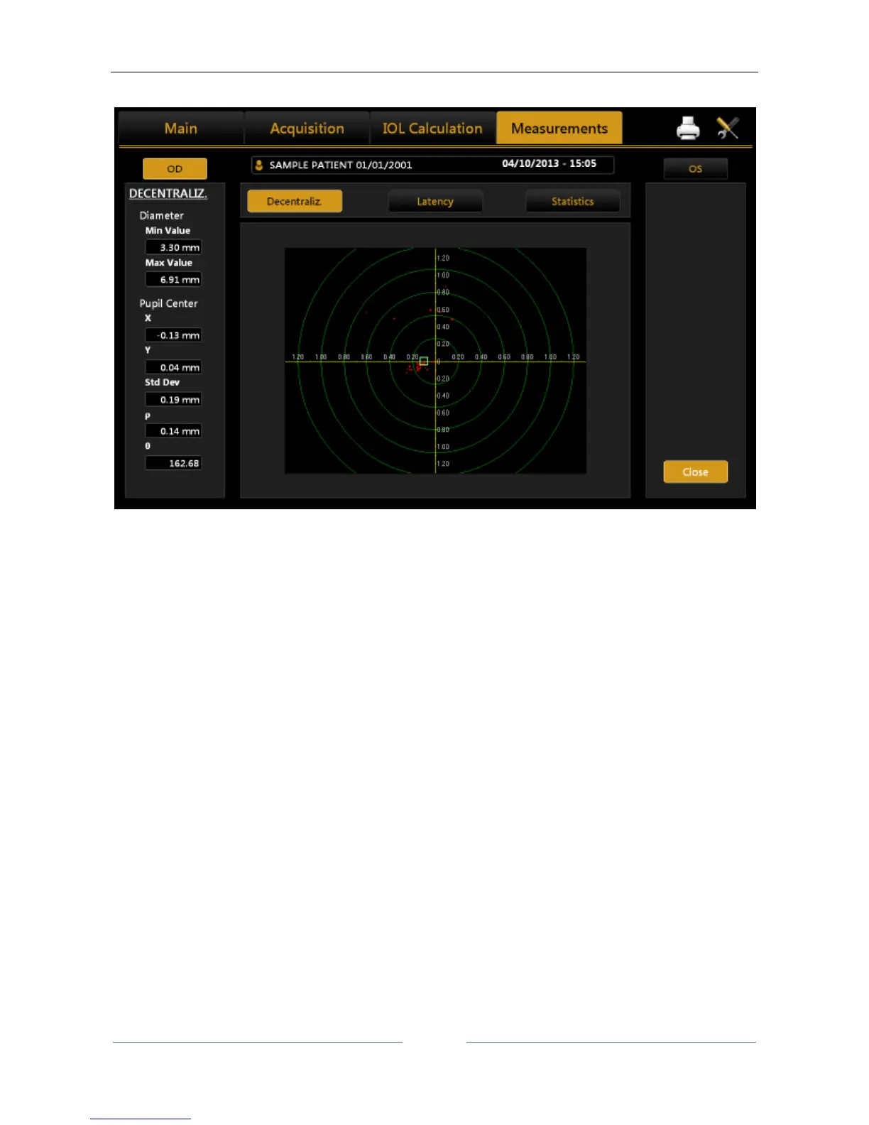 The green concentric circles identify the decentralization of the pupil center with respect to the fixation point.