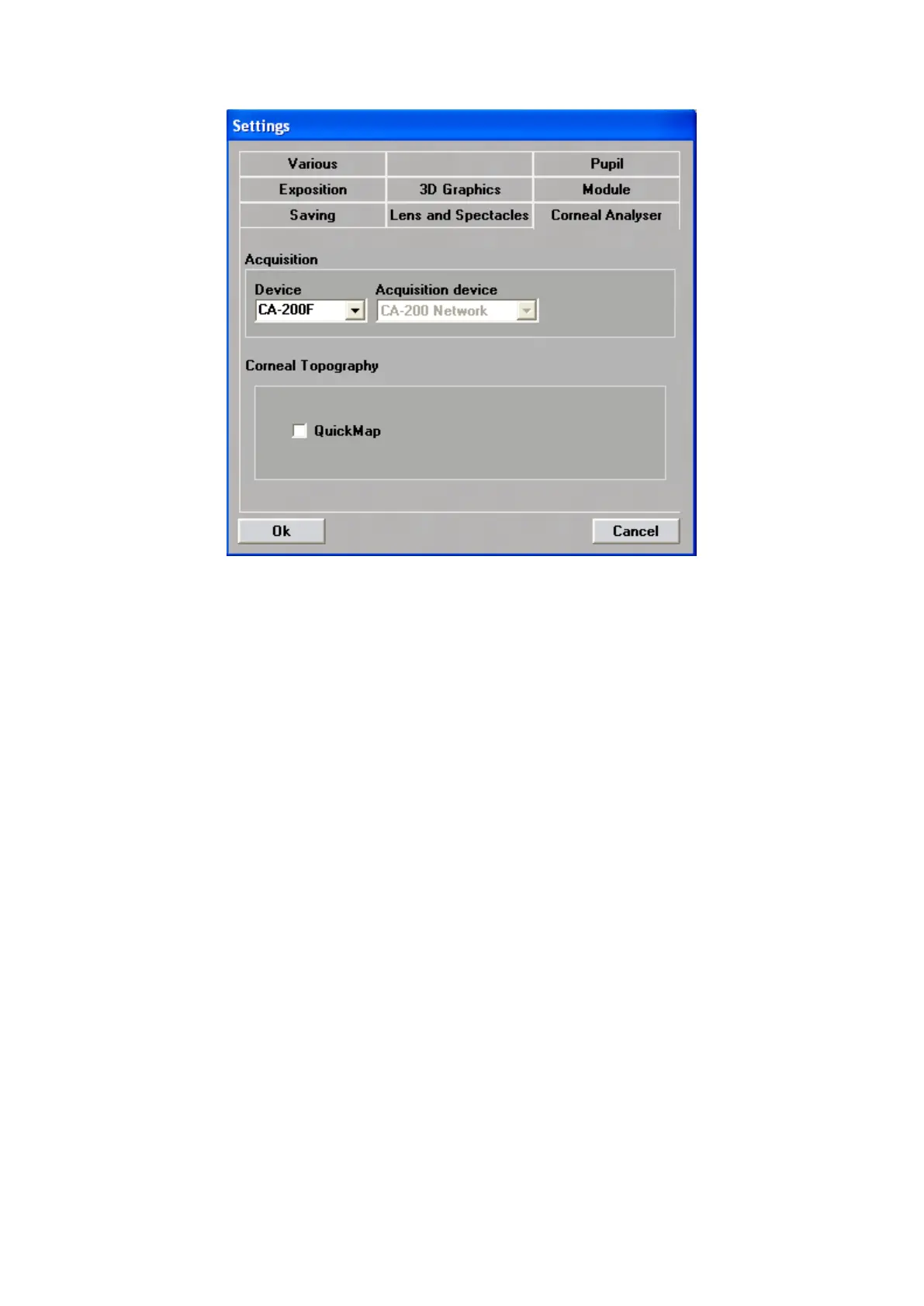 To select the acquisition device, tap on “Corneal Analyser, select CA-200F as instrument and press “Ok”