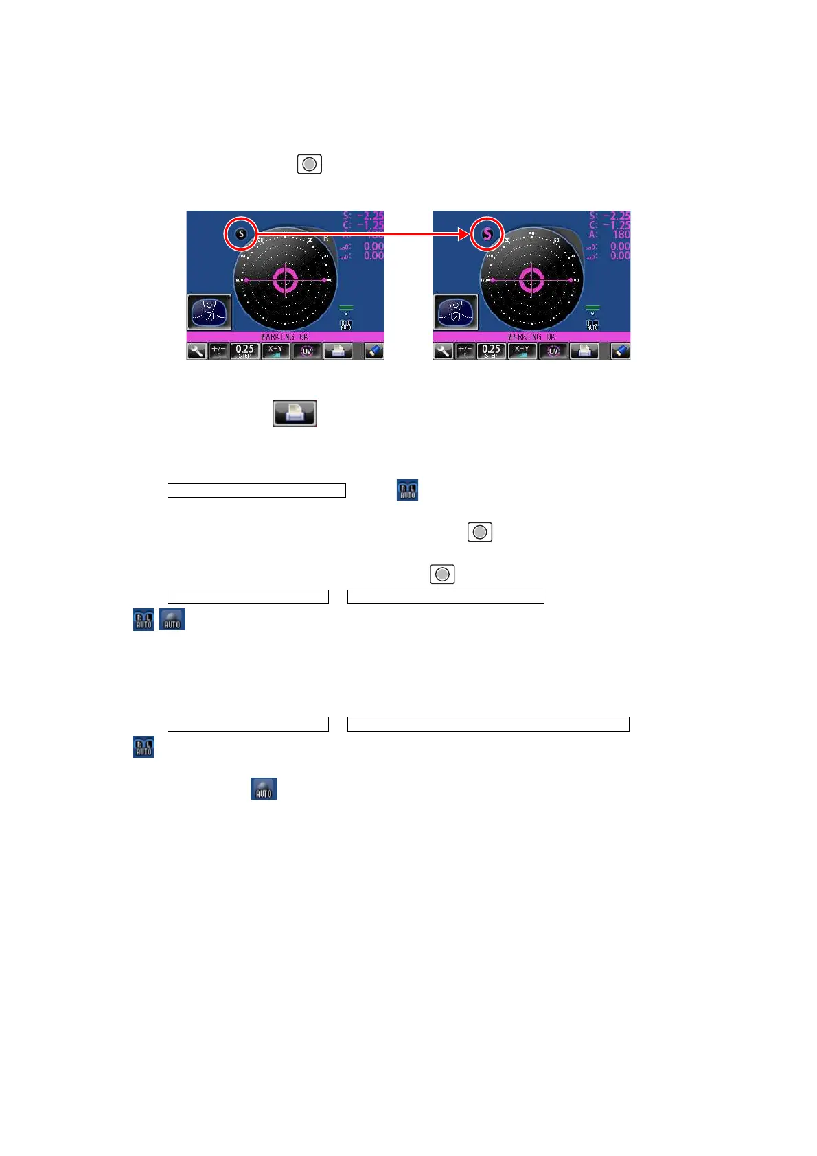 First, align the right lens to display “MARKING OK”. Then the result is automatically memo-