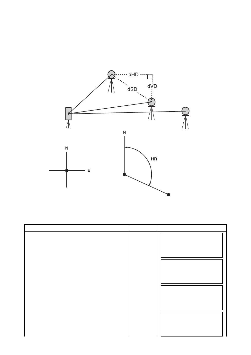 Measurement for horizontal distance (dHD), slope distance (dSD), elevation (dVD) and horizontal