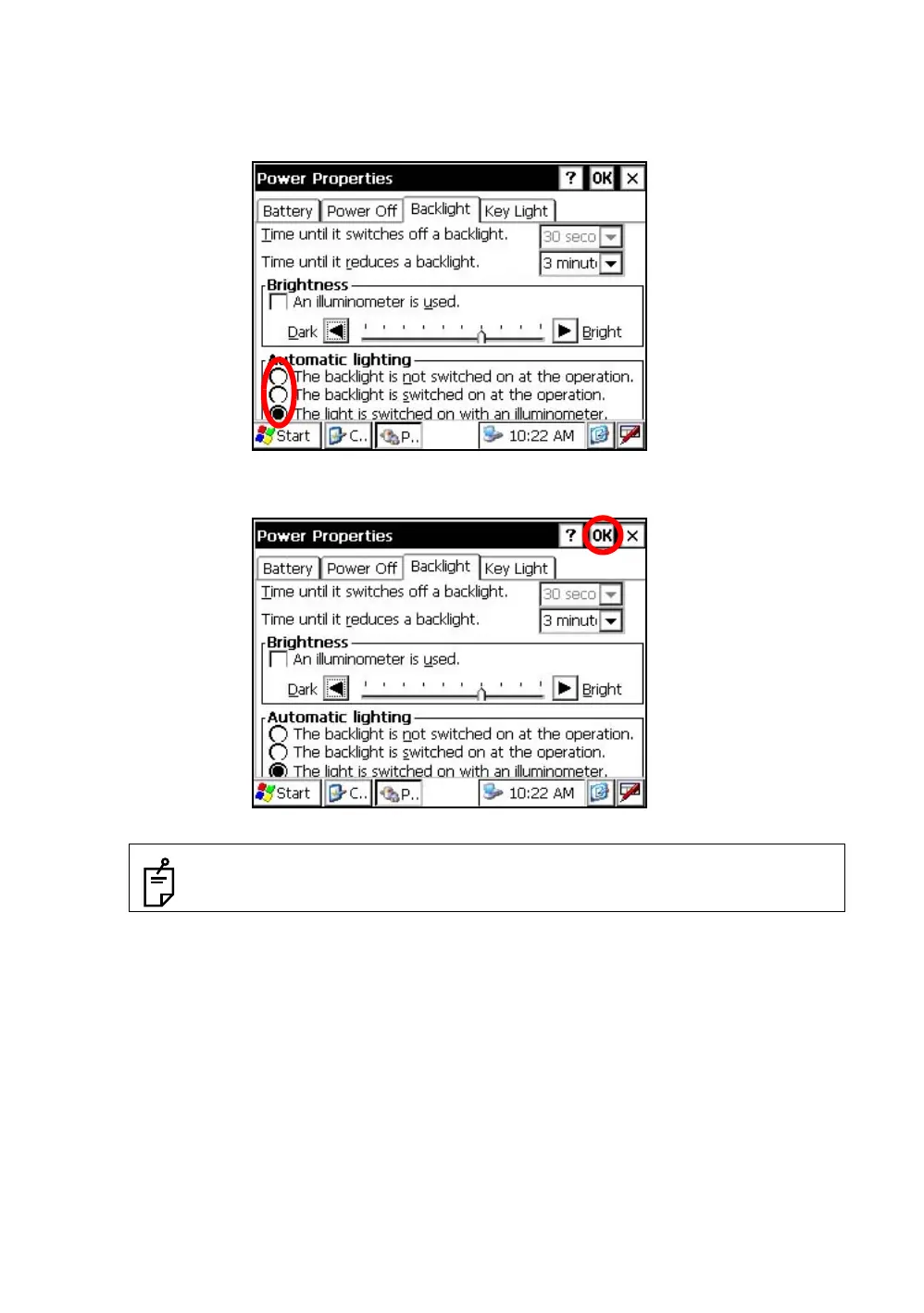 On the "Backlight" screen, select a Radio button from “Automatic lighting” column.