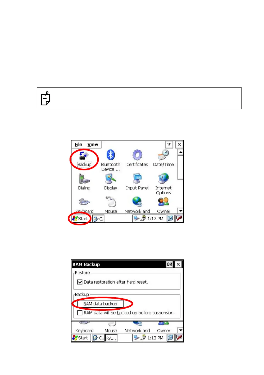 The Backup function saves all data files of RAM (except for OS files), registry file and additionally
