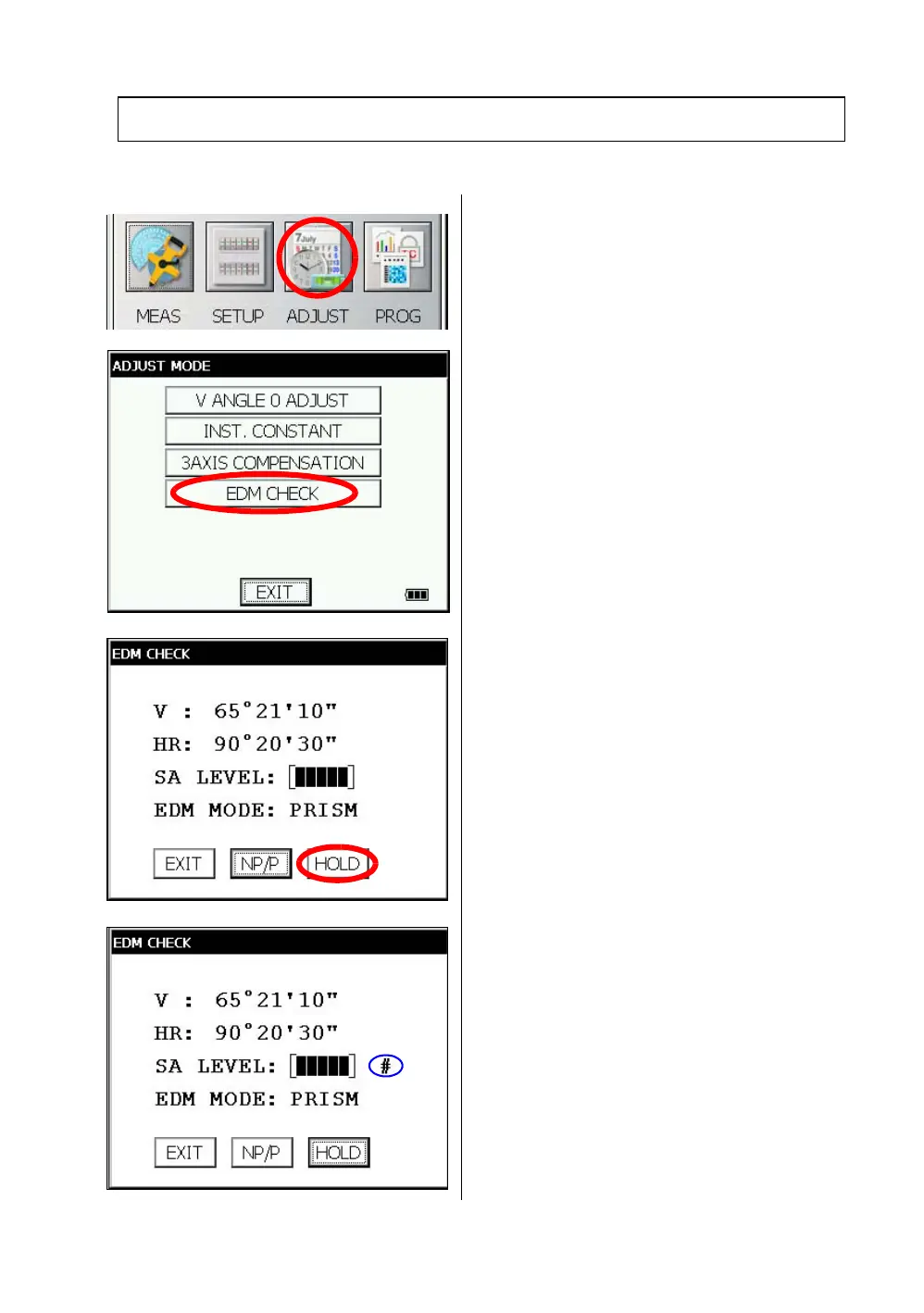 To check if the optical axis of EDM and theodolite are matched, follow the procedure below.