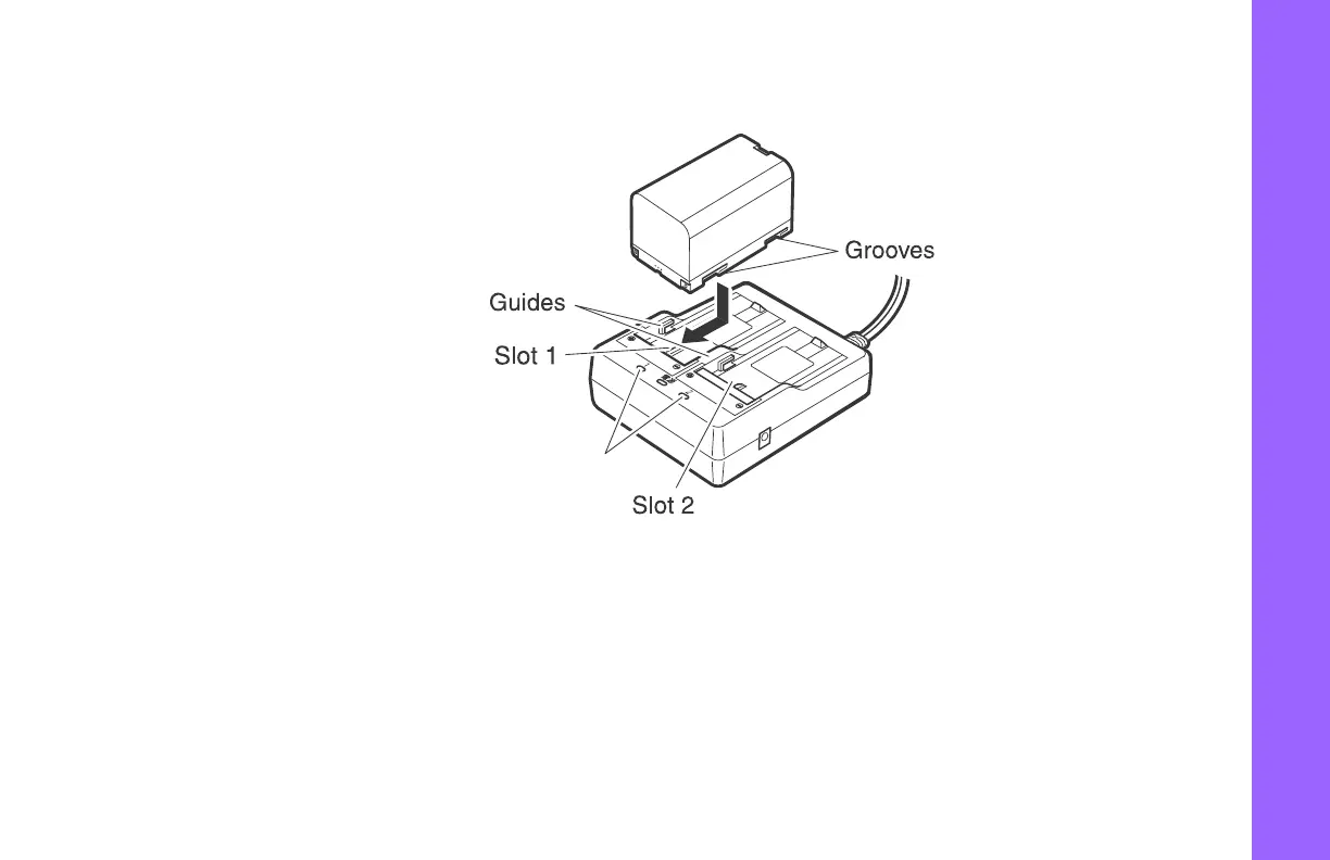 2. Mountthebatteryinthechargerbymatchingthegroovesonthebatterywiththeguidesonthecharger.