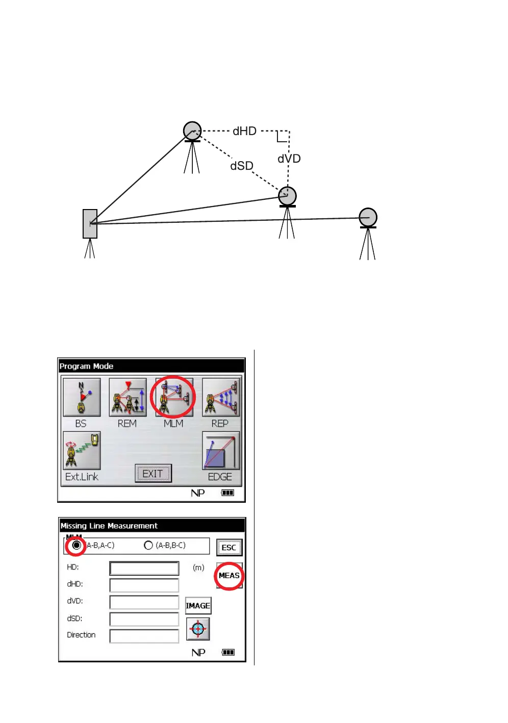 The Missing Line Measurement program calculates the horizontal distance (dHD), slope distance