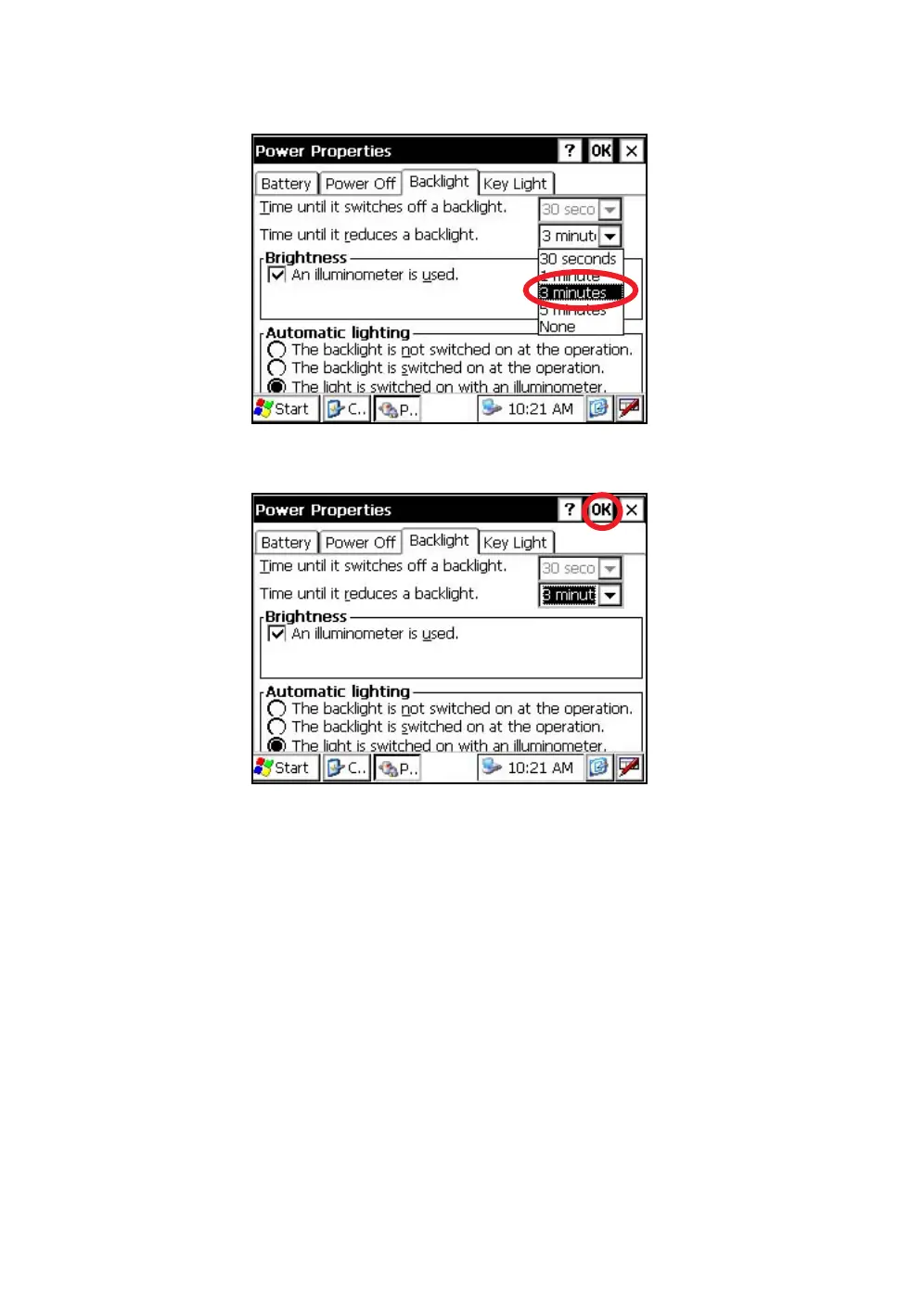 Press the [OK] key on title bar. After that "Power Properties" screen will close automatically.