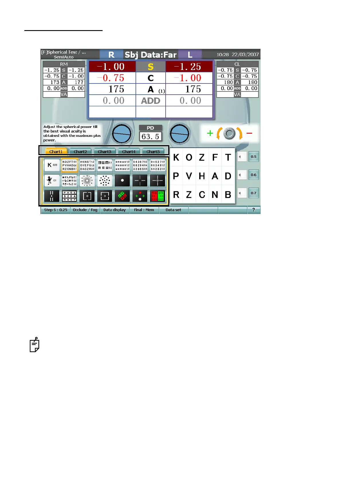 • Touch the chart picture. → Changing the chart + Executing the relevant test (Semi-Auto course