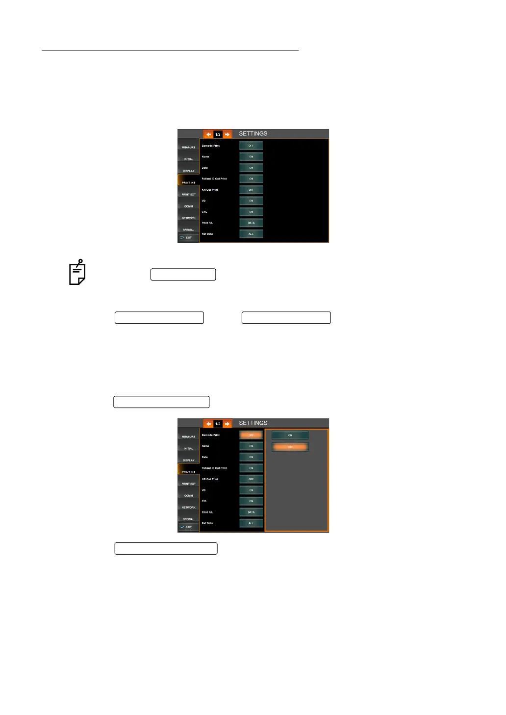 2 Tap the and select "ON" (Print barcode) or "OFF" (Do not print