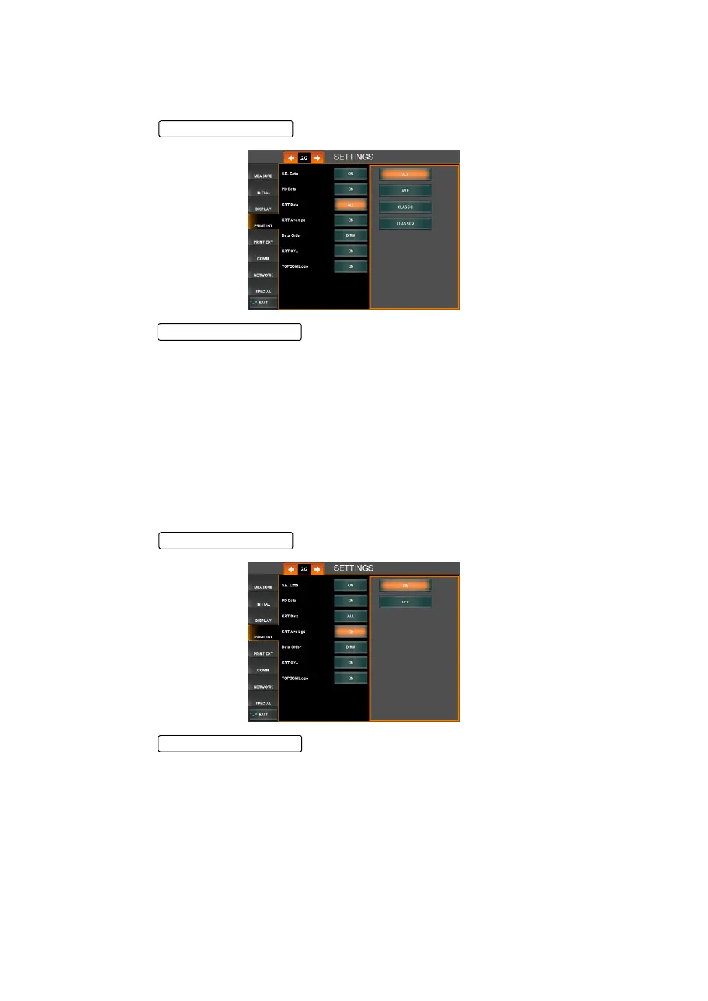 The print style of KRT values (cornea shape measurement values) can be set. Before ship-