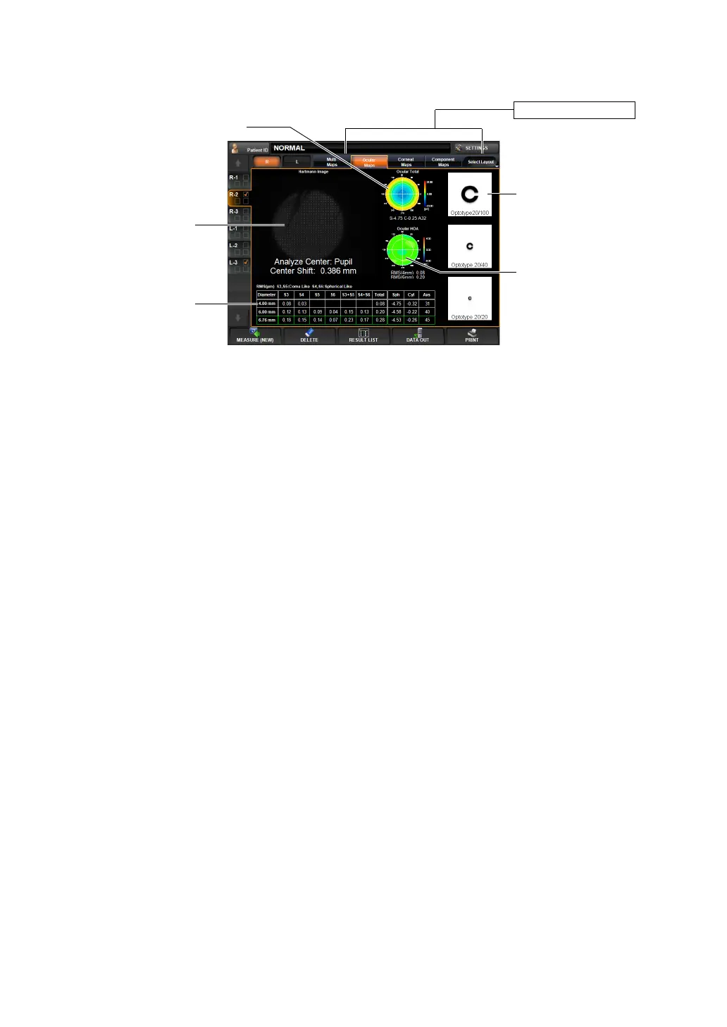 (3) Ocular HOA map (See "Ocular High Order Aberration Map" on page 80.)