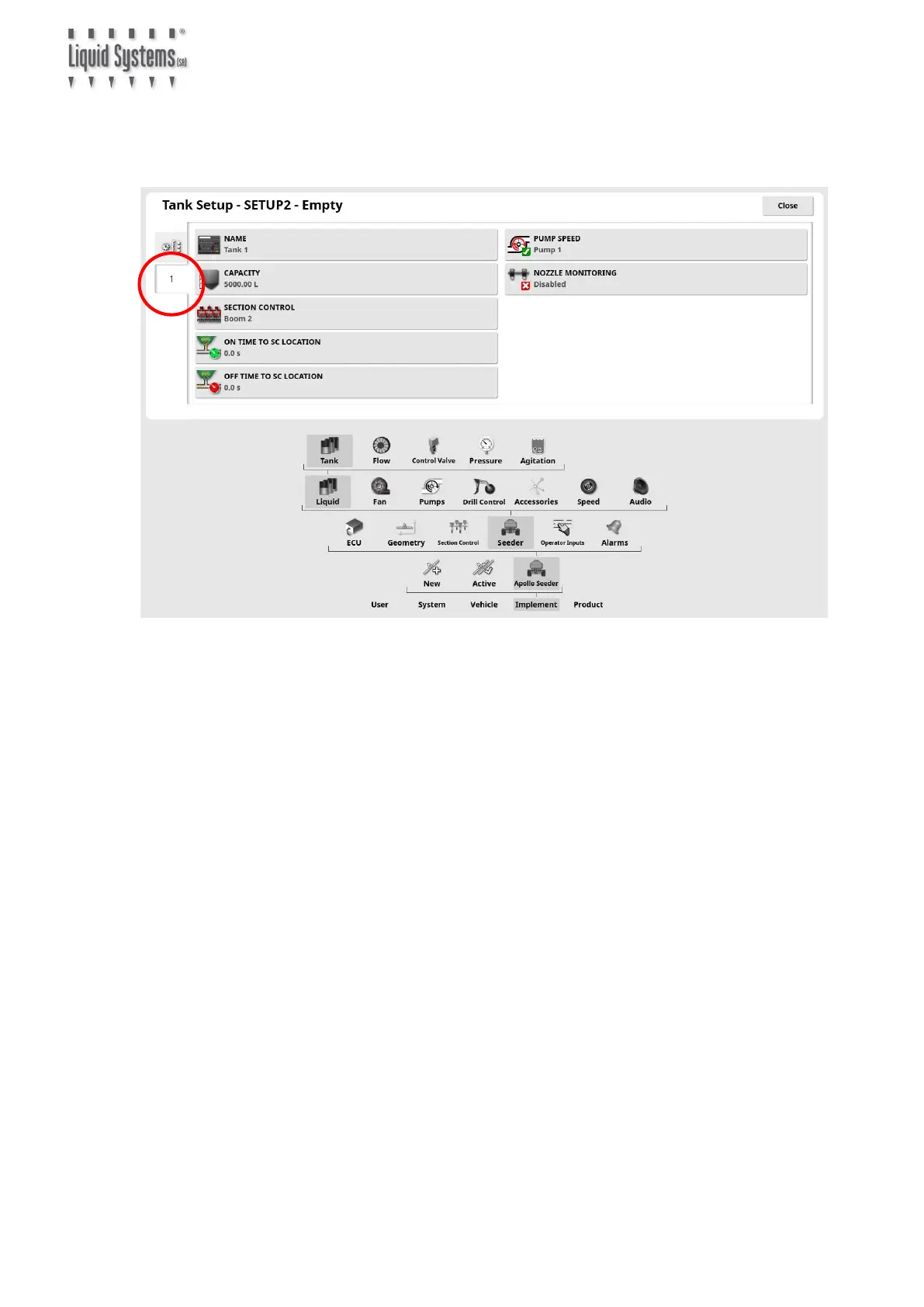 Select Implement, Seeder, Liquid & Tank icons from the setup menu to edit