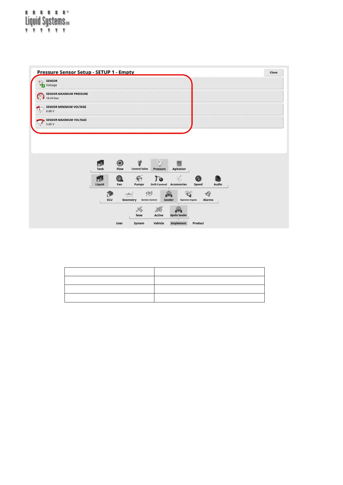 Select Pressure icon to edit pressure sensor setup.