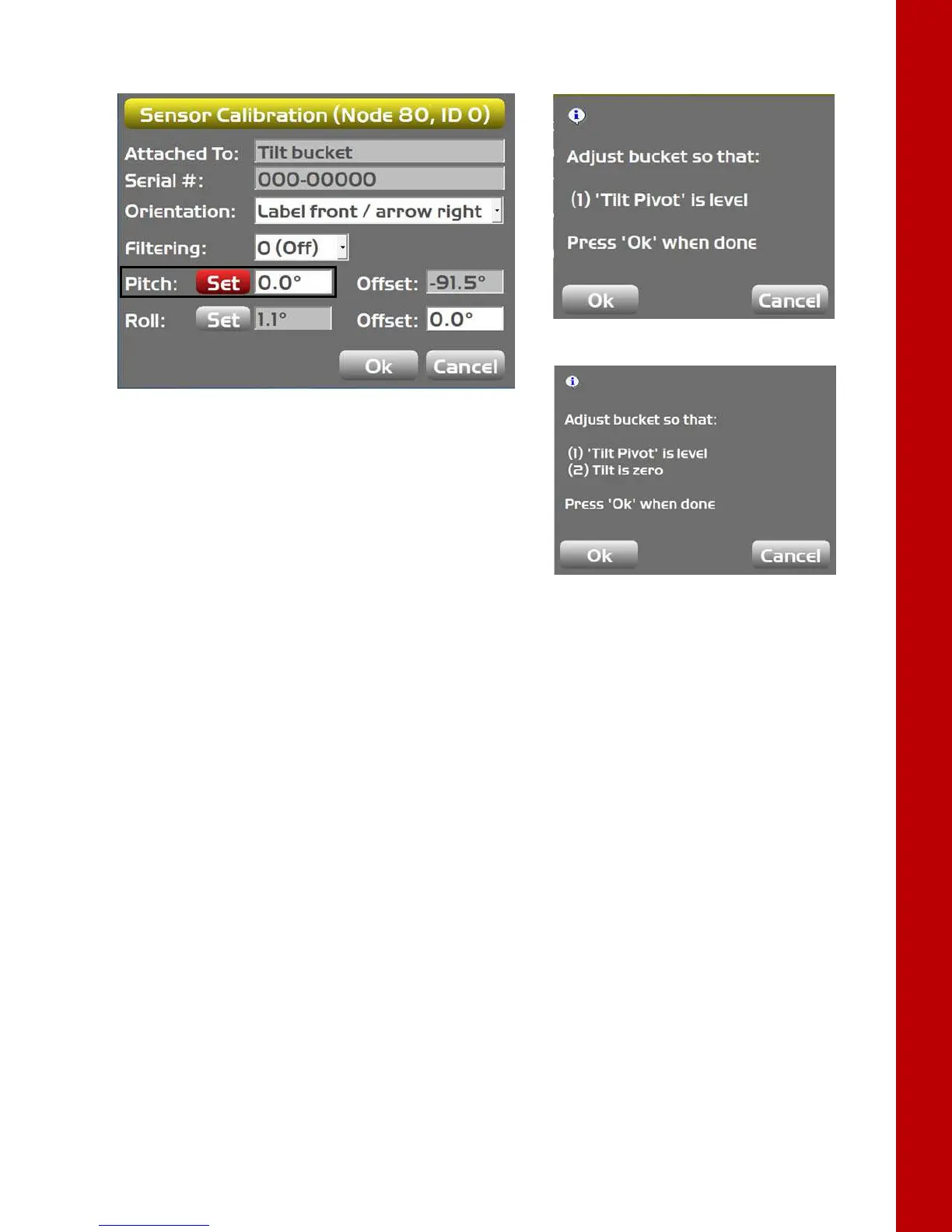 b. Dual-axis: Ensure the tilt axis (or pin) is horizontal and the tilt is level. Tap Ok.
