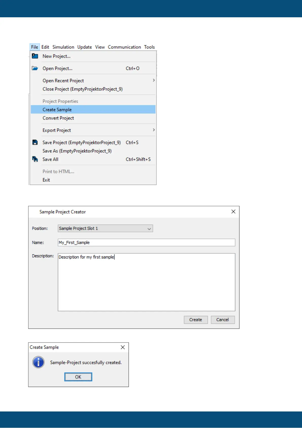 The creation of the sample project will be confirmed in a dialog.