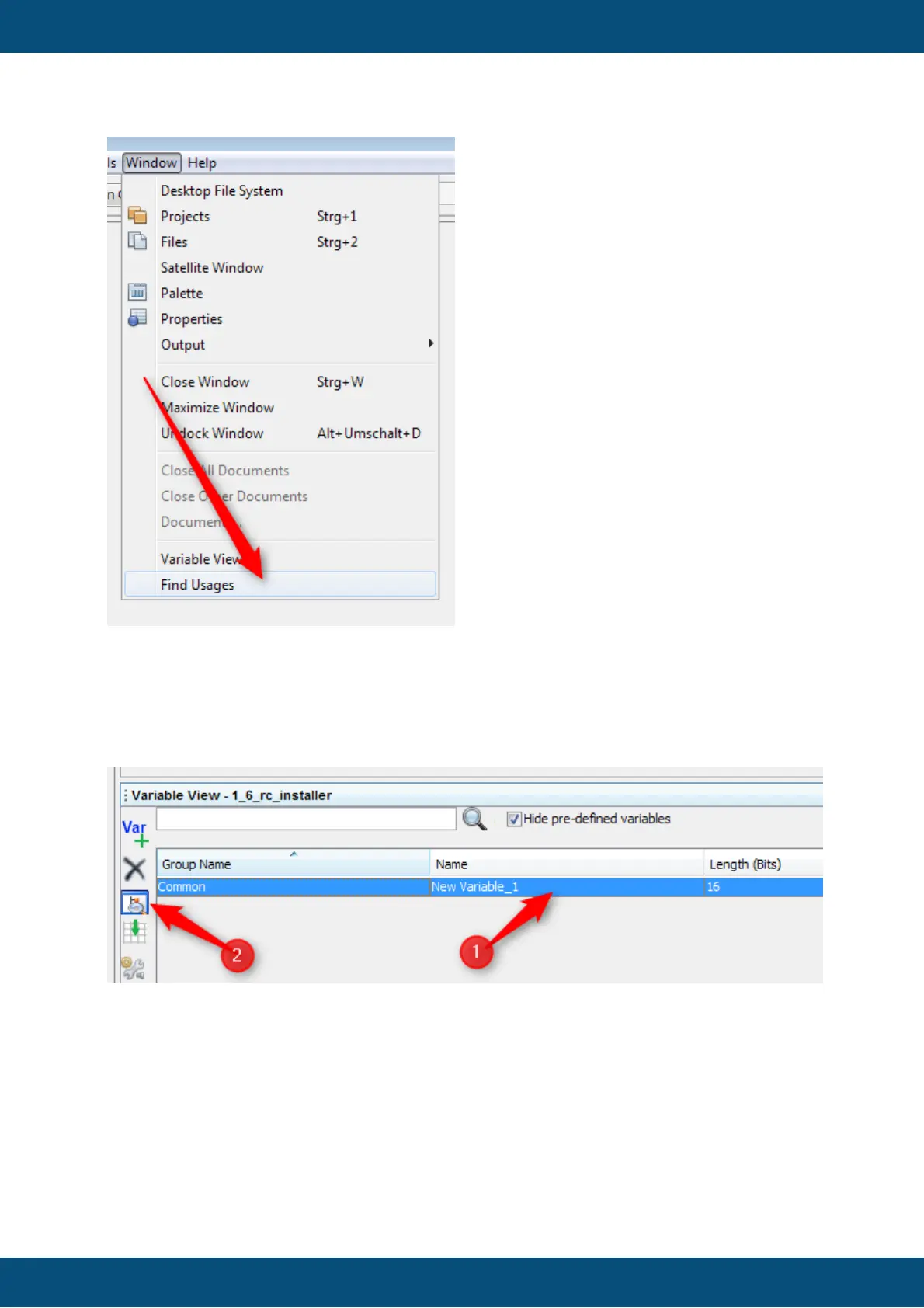 variable (1) and than click the find usage icon (2) or, alternatively, right-click on the selected