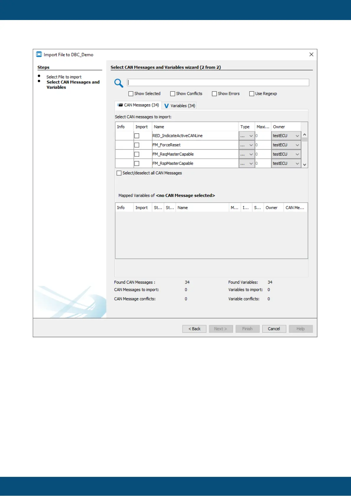 In the second step of the dialog the CAN messages and variables for import can be selected.