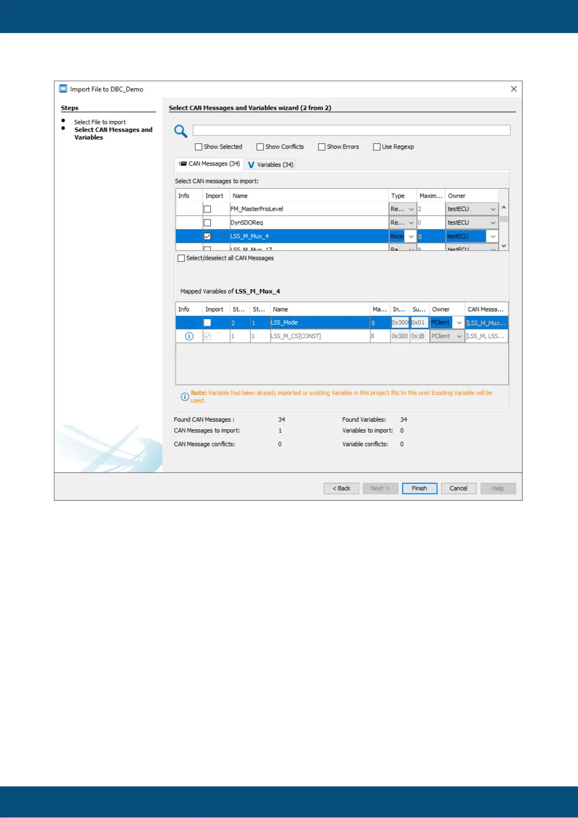 In the bottom of the dialog an overview of the CAN messages and variables in the DBC file