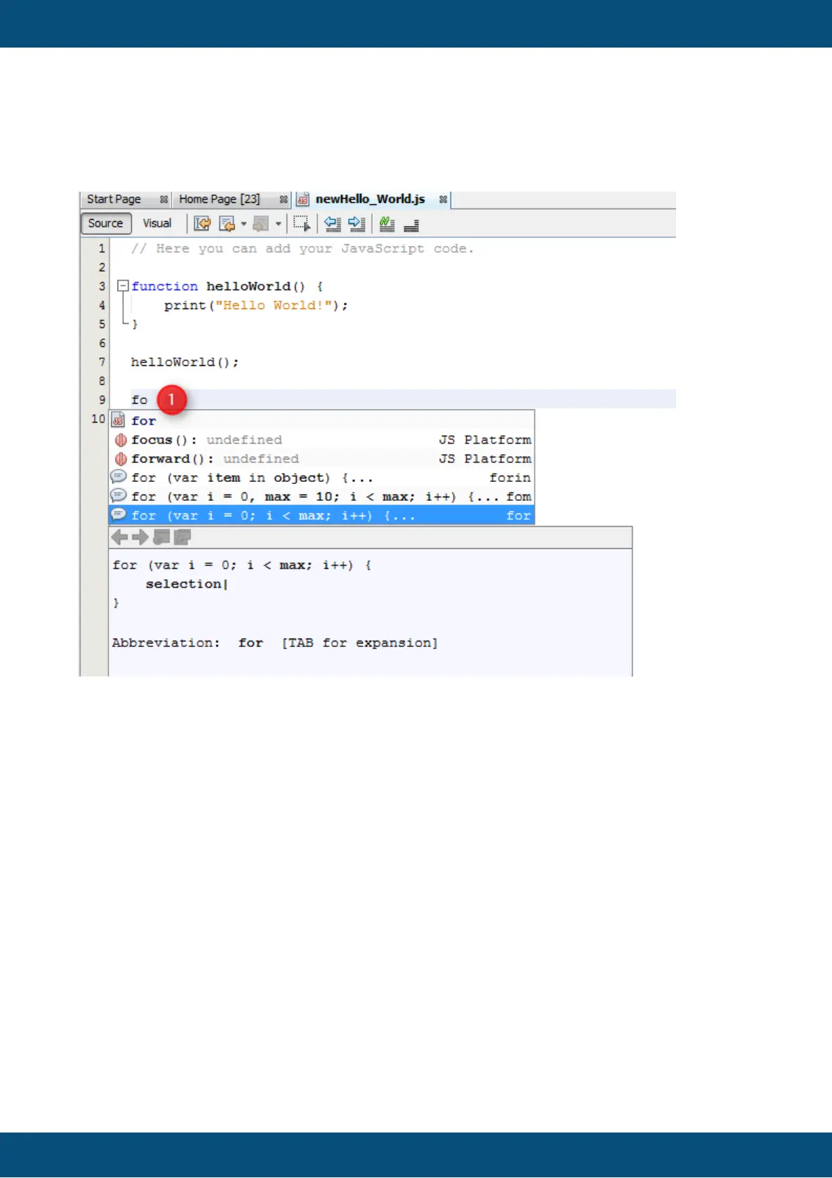 menu pops up with the keyword completion "for" and additional suggestions for whole "for
