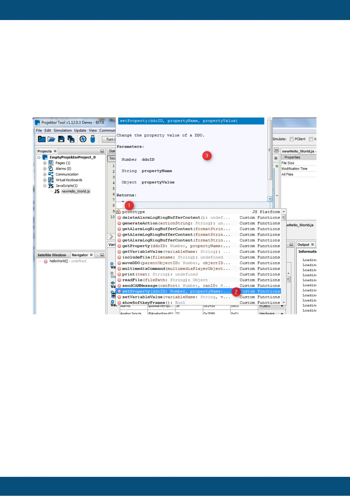By pressing CTRL+SPACE in the JavaScript editor content area (1), a list with auto complete