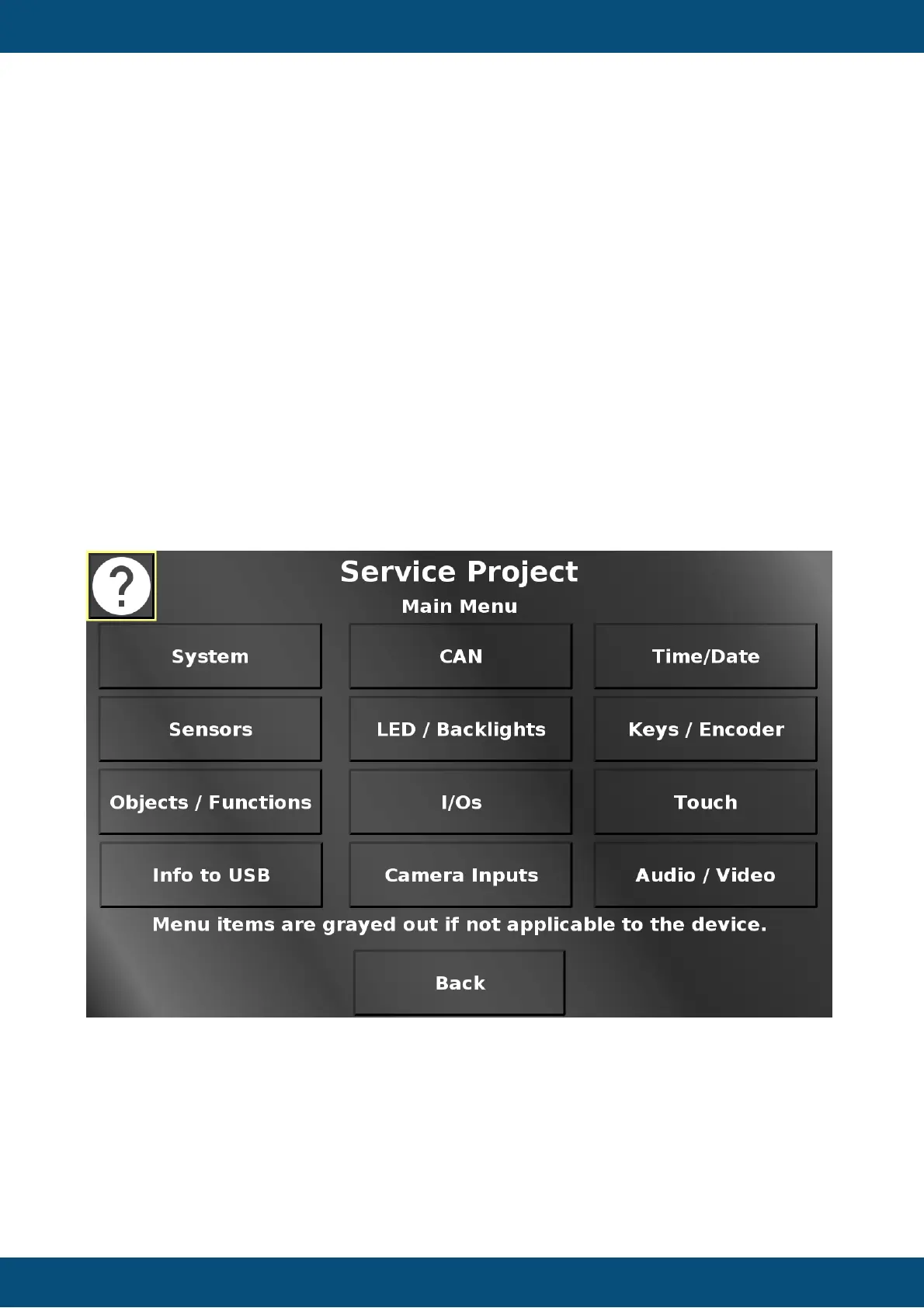 In this screen the different main menu items can be chosen. Back returns to the main screen.
