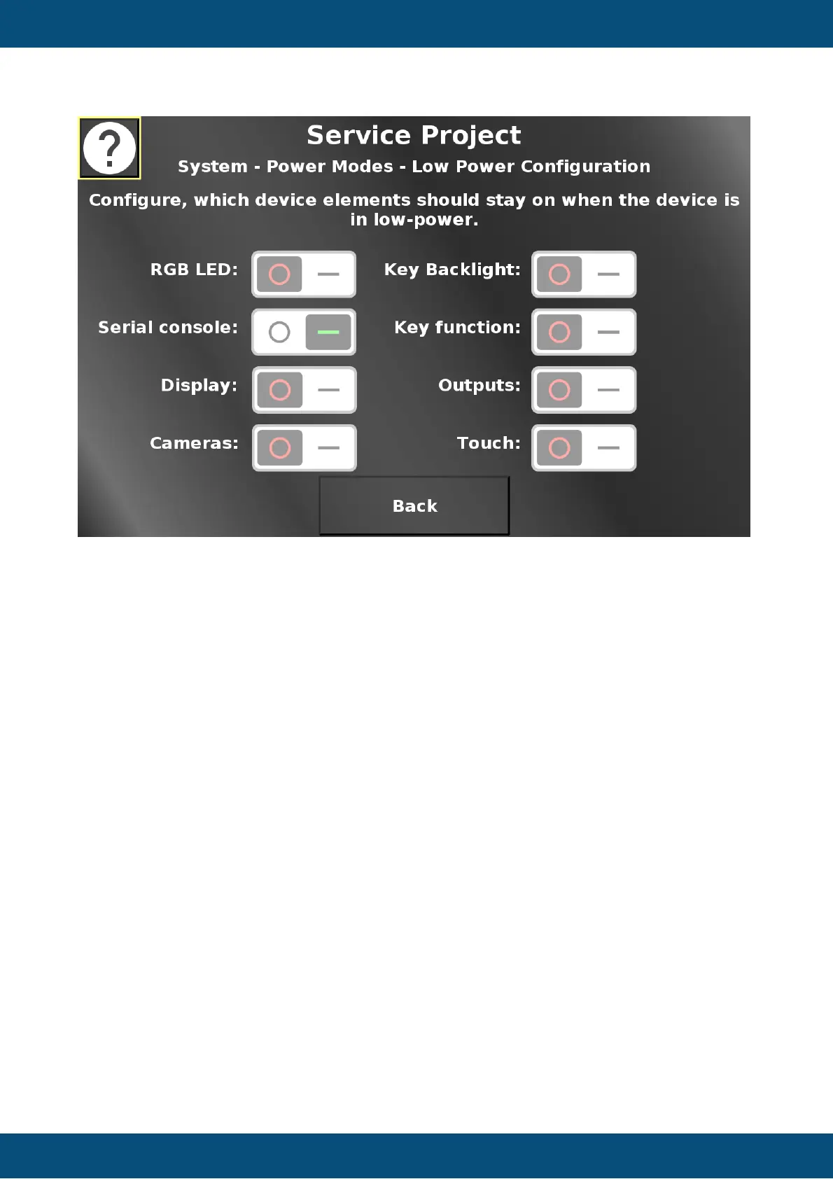 In this screen, hardware elements can be configured to stay on or turn off when low power