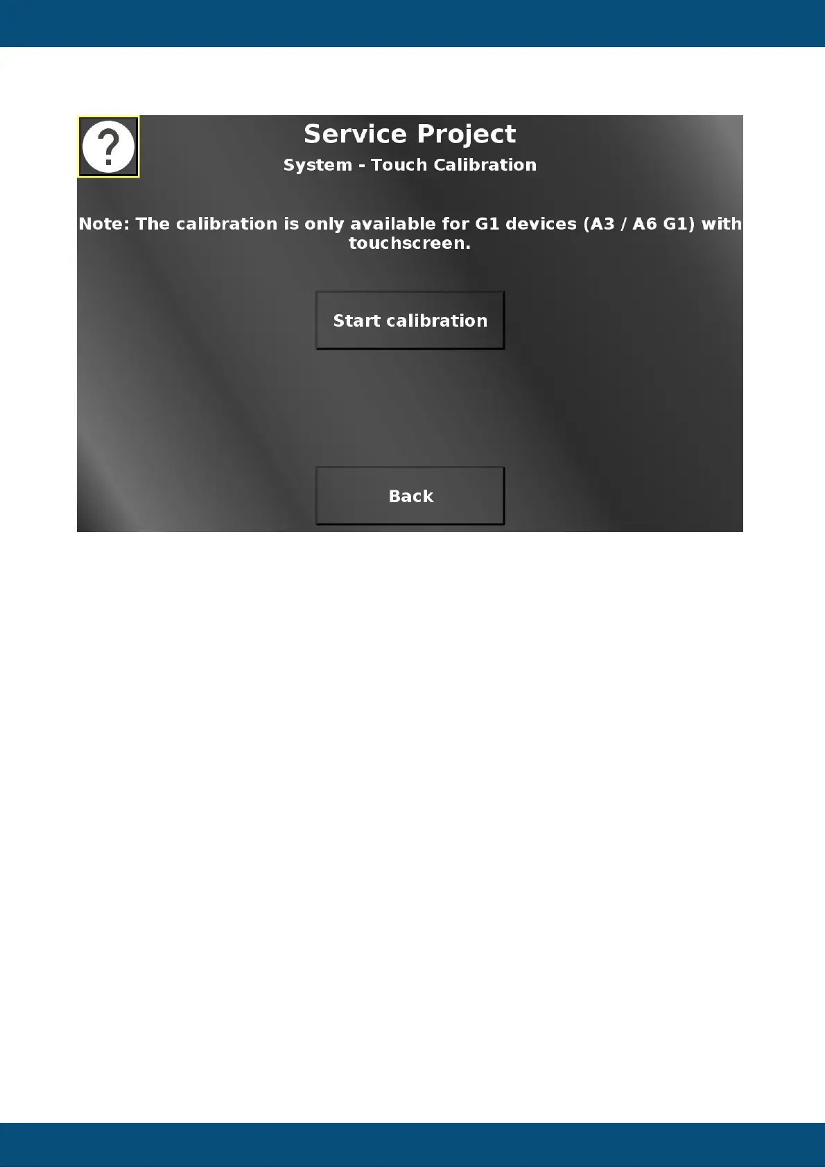 In this screen the touch screen calibration can be started. 5 cross hairs will appear one after