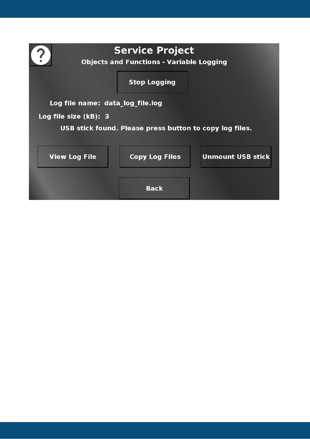 copied to a connected USB stick by pressing Copy Log Files. Press Unmount USB stick to