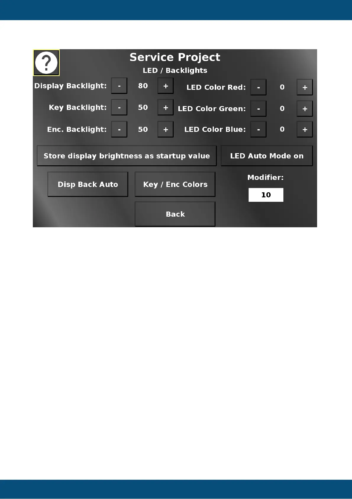 The LED / Backlights screen allows changing the values for display, key, encoder backlight