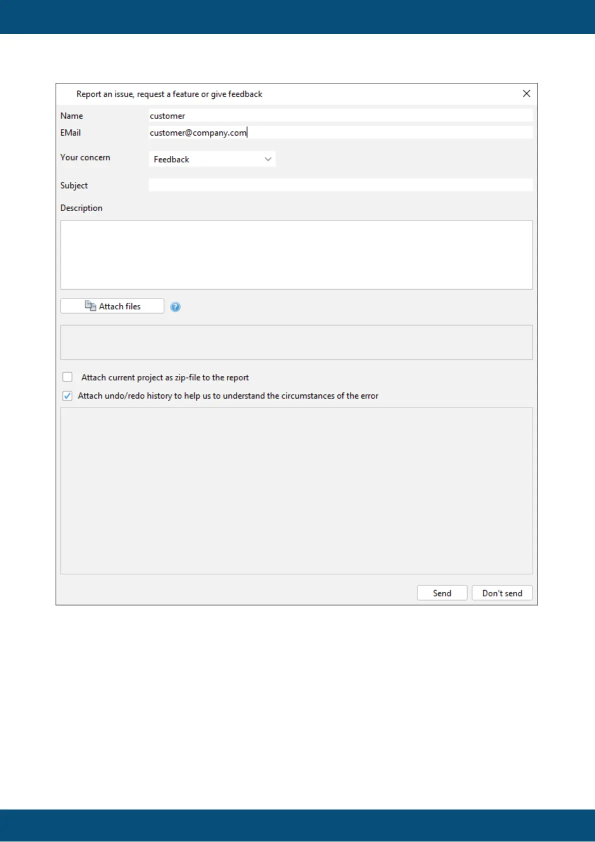 The dialog for feedback and feature request are both very similar to the crash report with the