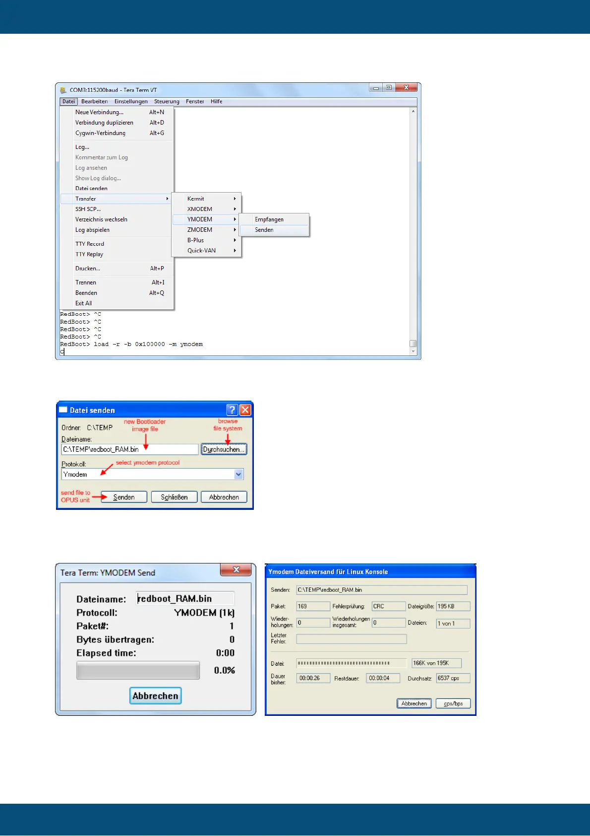 In HyperTerminal choose the menu Transfer -> Send file and choose the boot loader file in