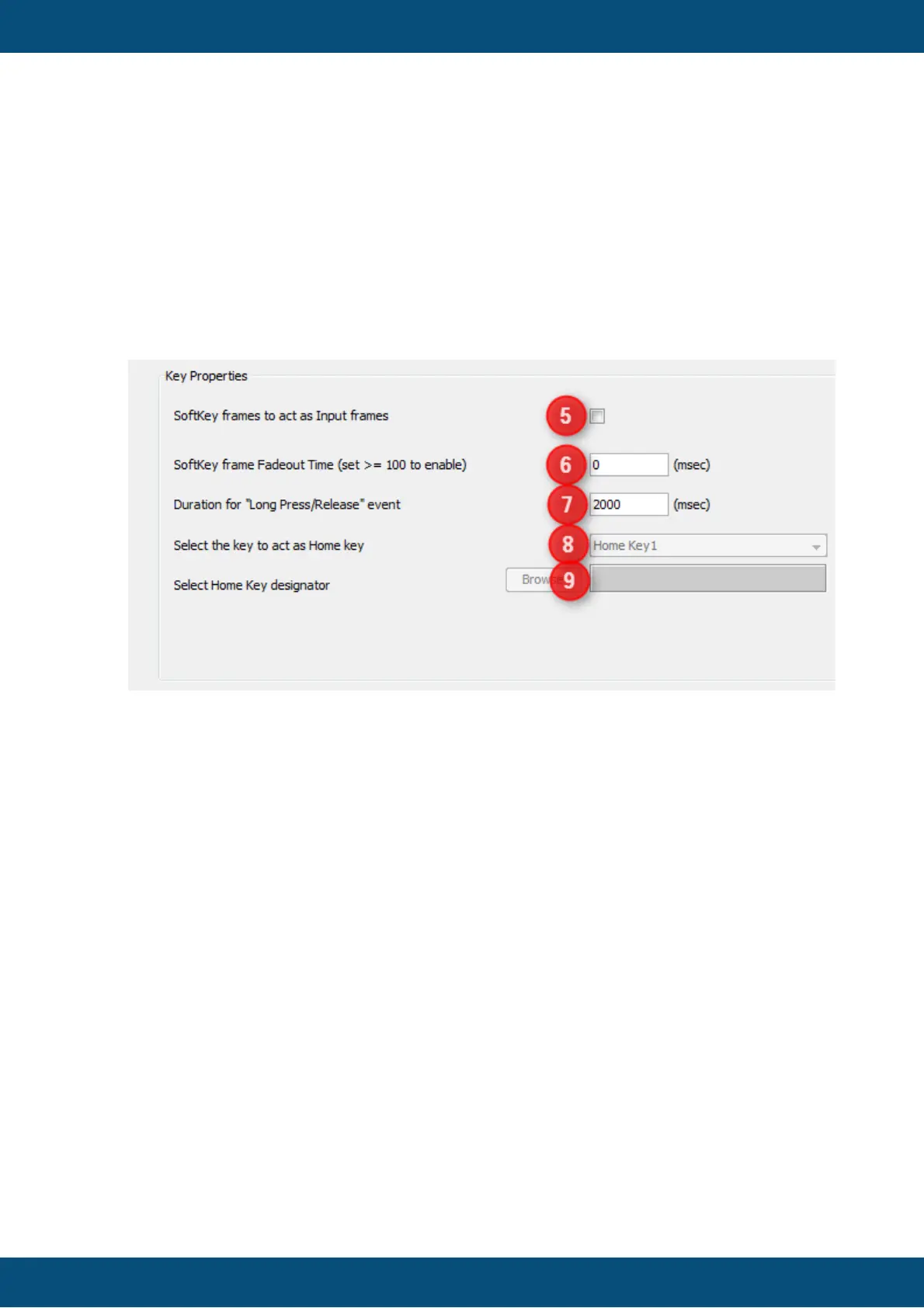 This value defines the delay time until the softkey frames are faded out (i.e. hidden).