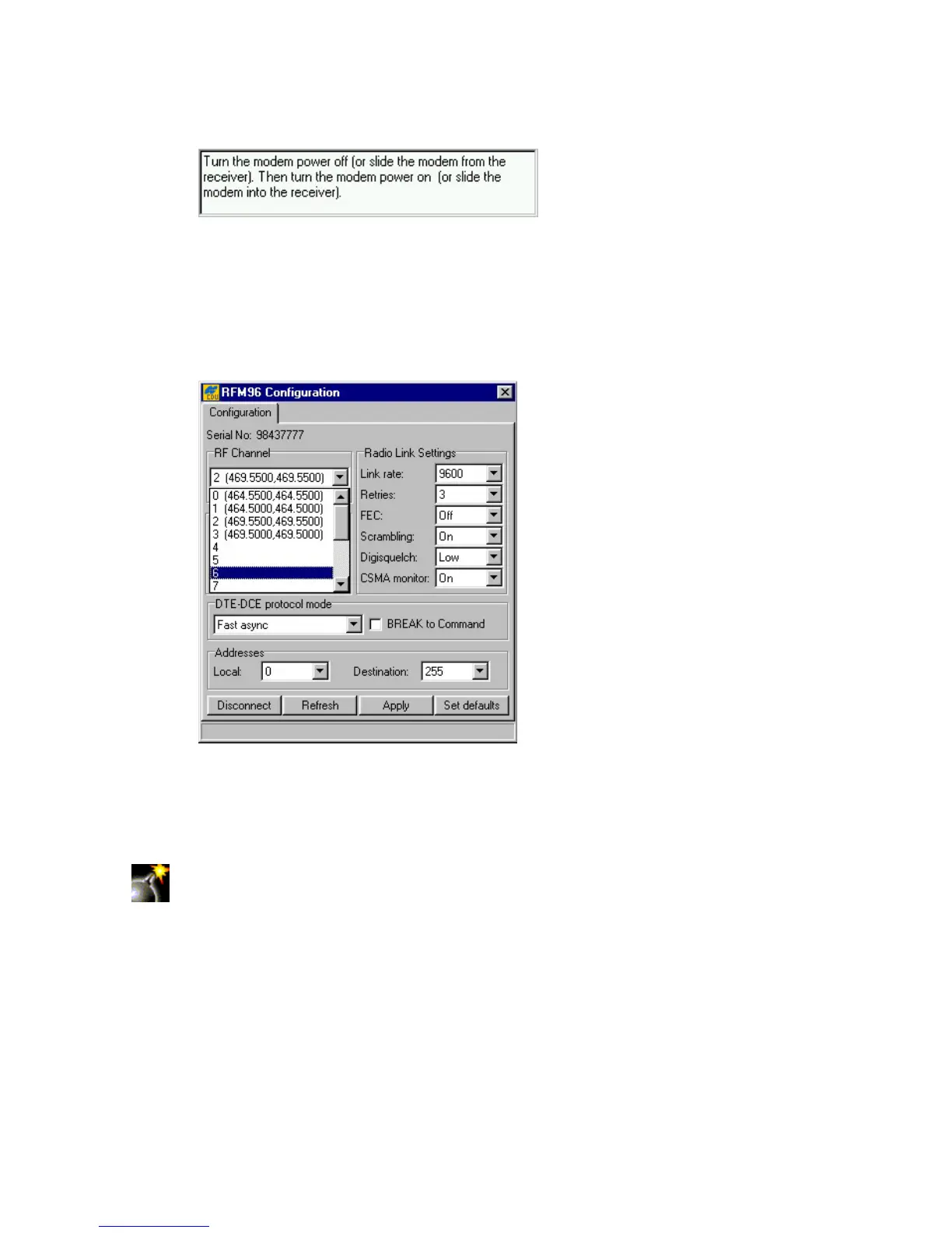 After a connection with the modem is established, one will see a dialog window showing the radio