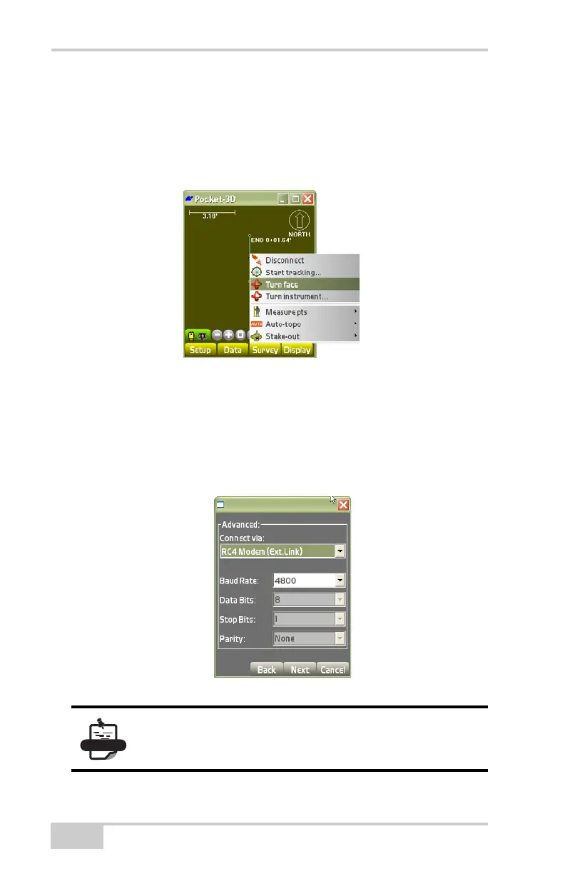 Tap SurveyConnect, then press SurveyTurn face. Pressing