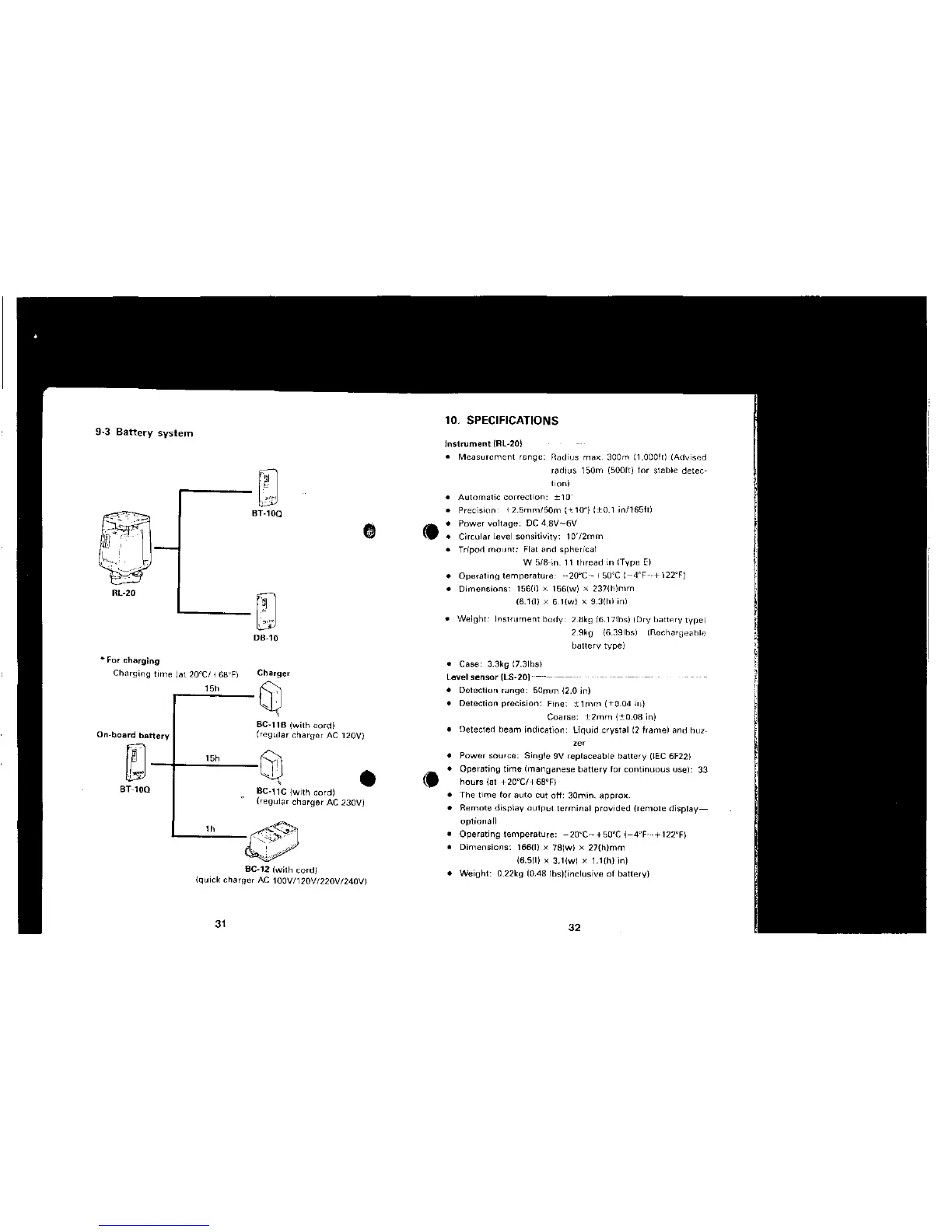 Topcon RL-20 - BATTERY SYSTEM; Battery Charging Overview; SPECIFICATIONS; Instrument (RL-20) Specifications