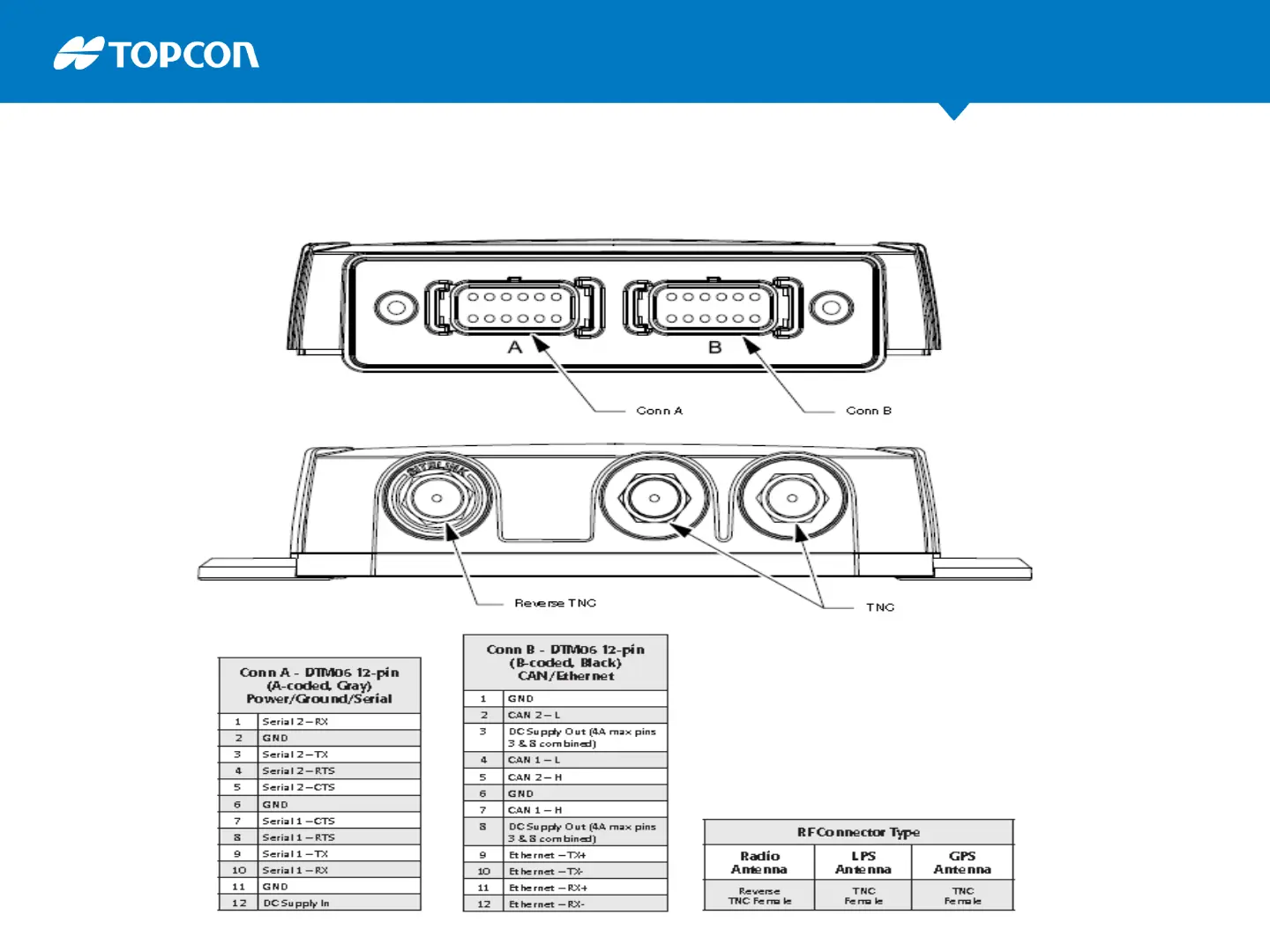 Topcon SL-100 - Connectors Pinouts; Conn A Pinout; Conn B Pinout; RF Connector Types