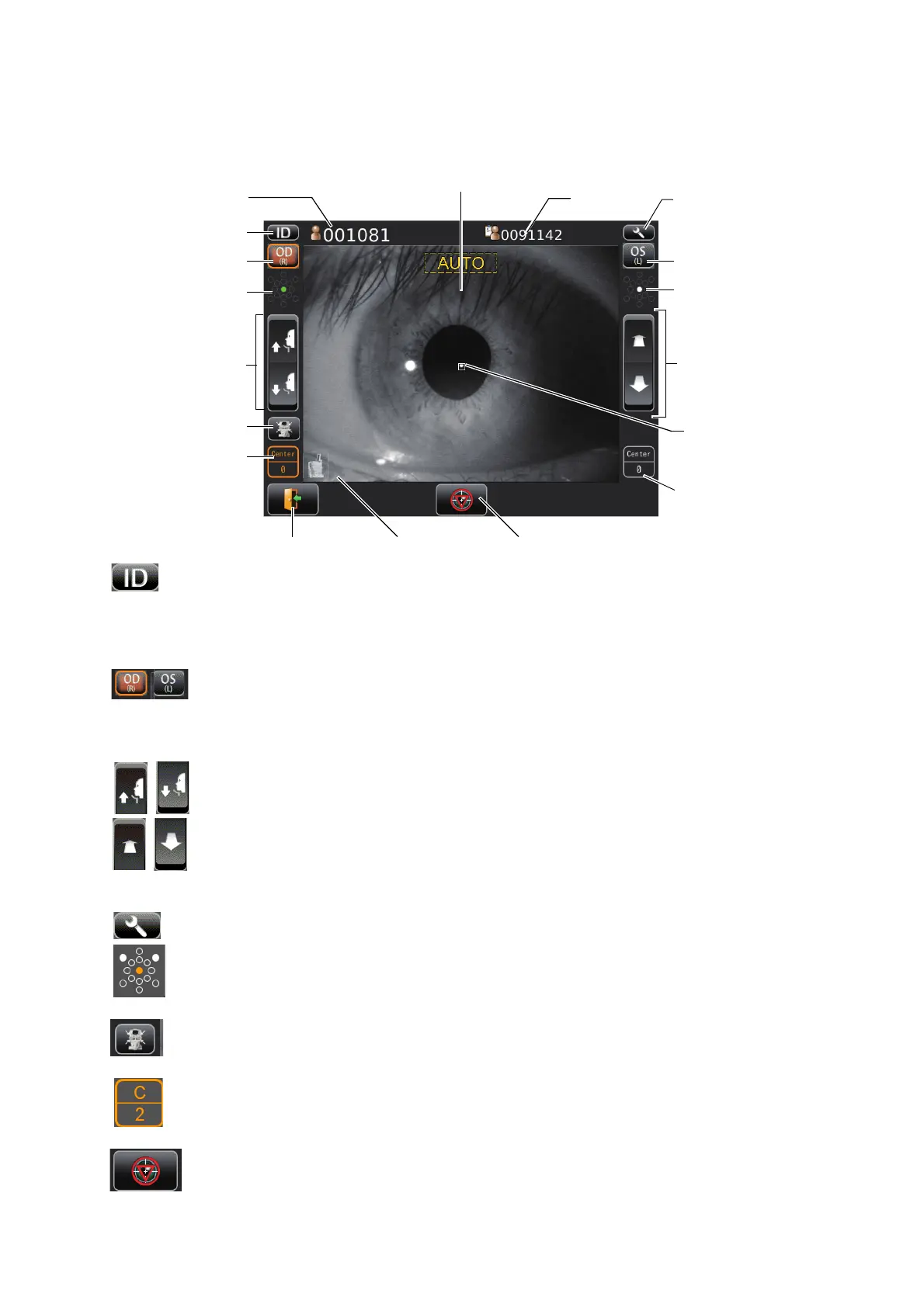 OD button/OS button......................Select the right eye or left eye. The main body moves to
