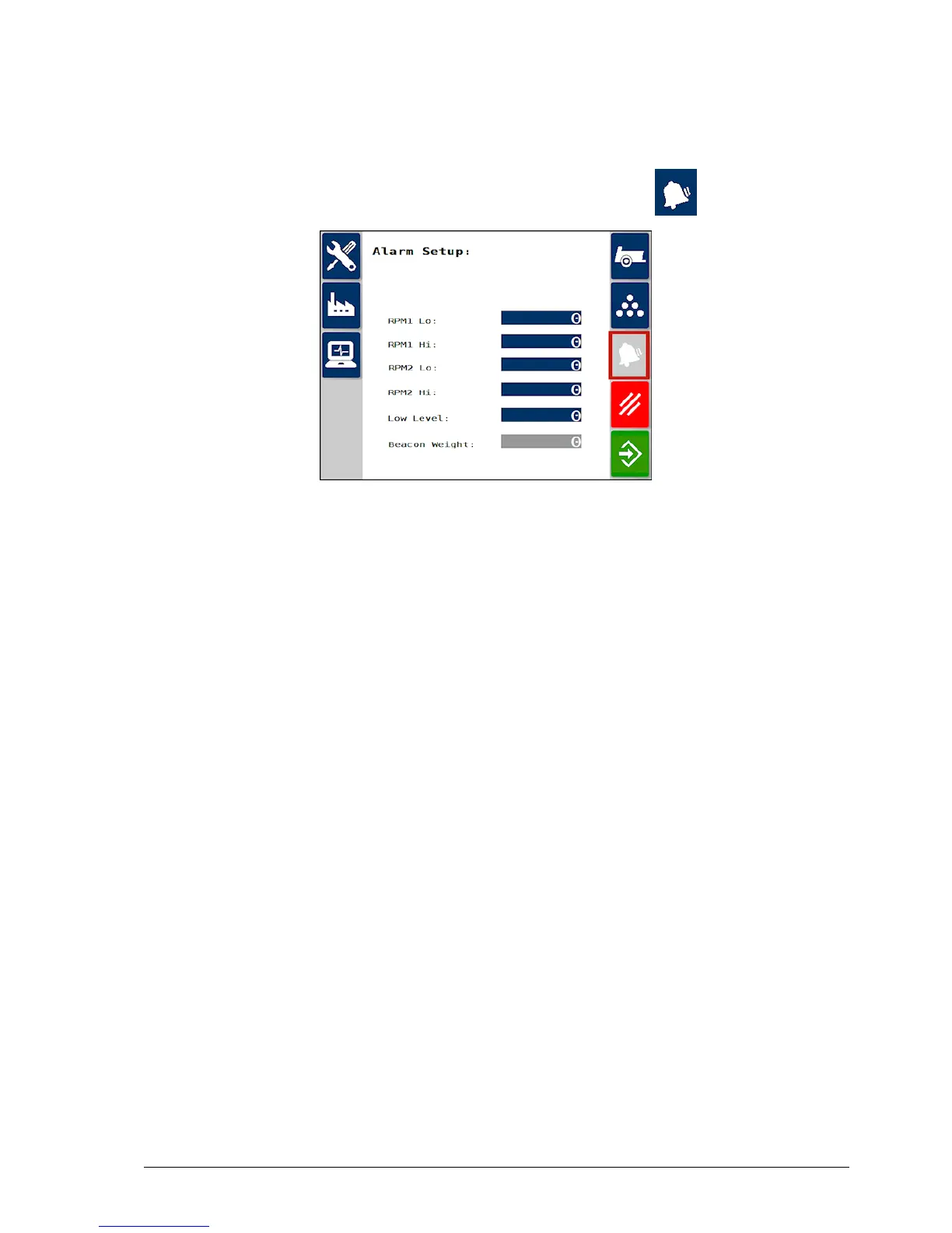 From the Spreader Settings screen, select Alarms .